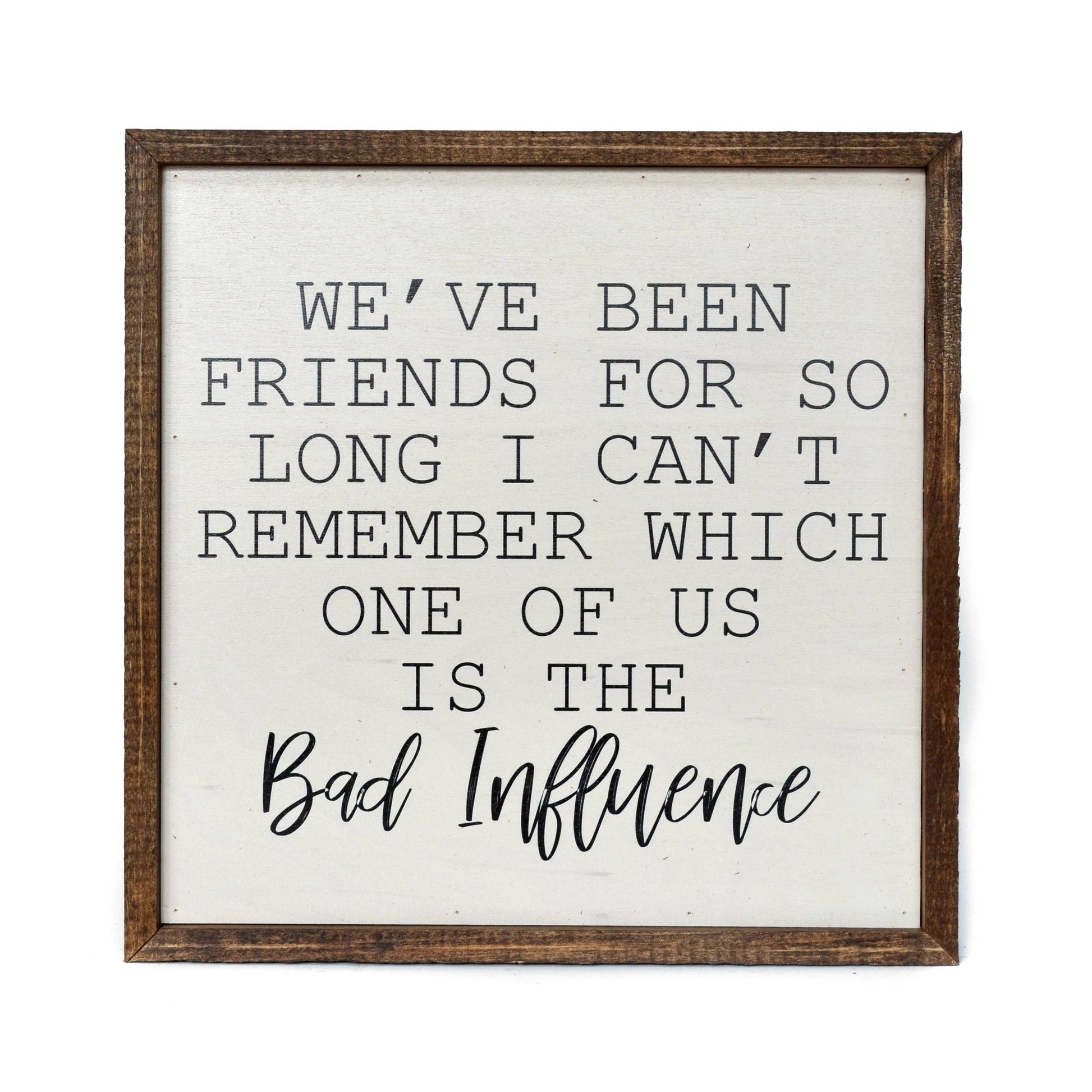 We've Been Friends For So Long I Can't Remember Which One Of Us Is The Bad Influence Wall Hanging. All our signs are build into a wooden box frame with a rustic touch. Signs are hung directly off the frame.