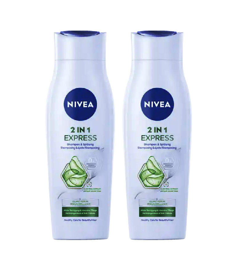 The pH-optimized 2-in-1 Express Shampoo & Conditioner with Nivea Shine Serum and Aloe Vera nourishes in the shortest possible time and strengthens every strand of hair for more resistance. The formula with dermatologically confirmed skin compatibility harmonizes with the natural pH value of hair and scalp. The valuable Nivea shine serum gives healthy, naturally beautiful hair: Nivea 2in1 Express pH-Balance Shampoo & Conditioner.