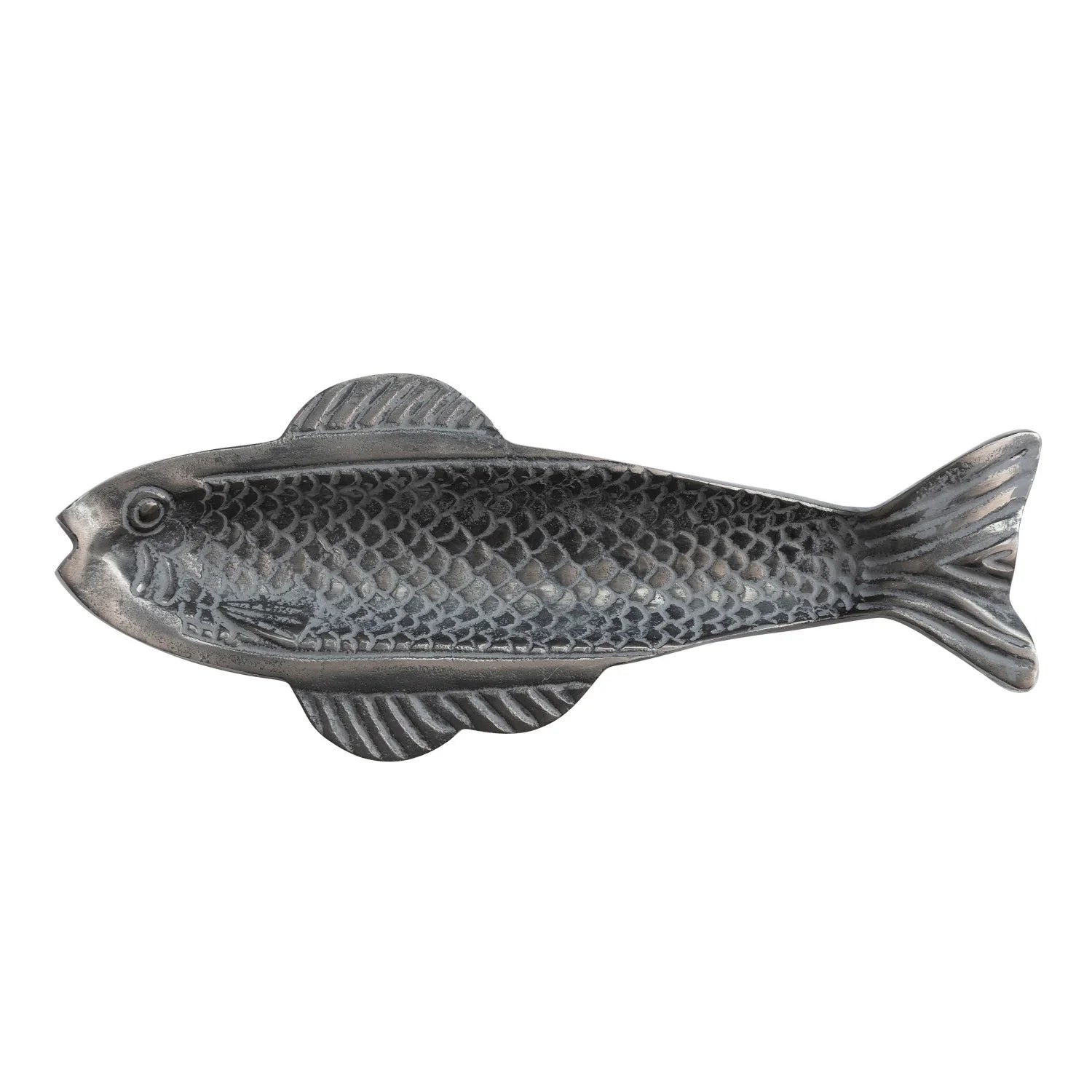This cast aluminum fish-shaped dish is sure to make a statement in any room. Its rubbed bronze finish offers a stylish and classic look to any decor. Crafted from robust aluminum and finished with a bronze rub, this dish is durable and long-lasting.