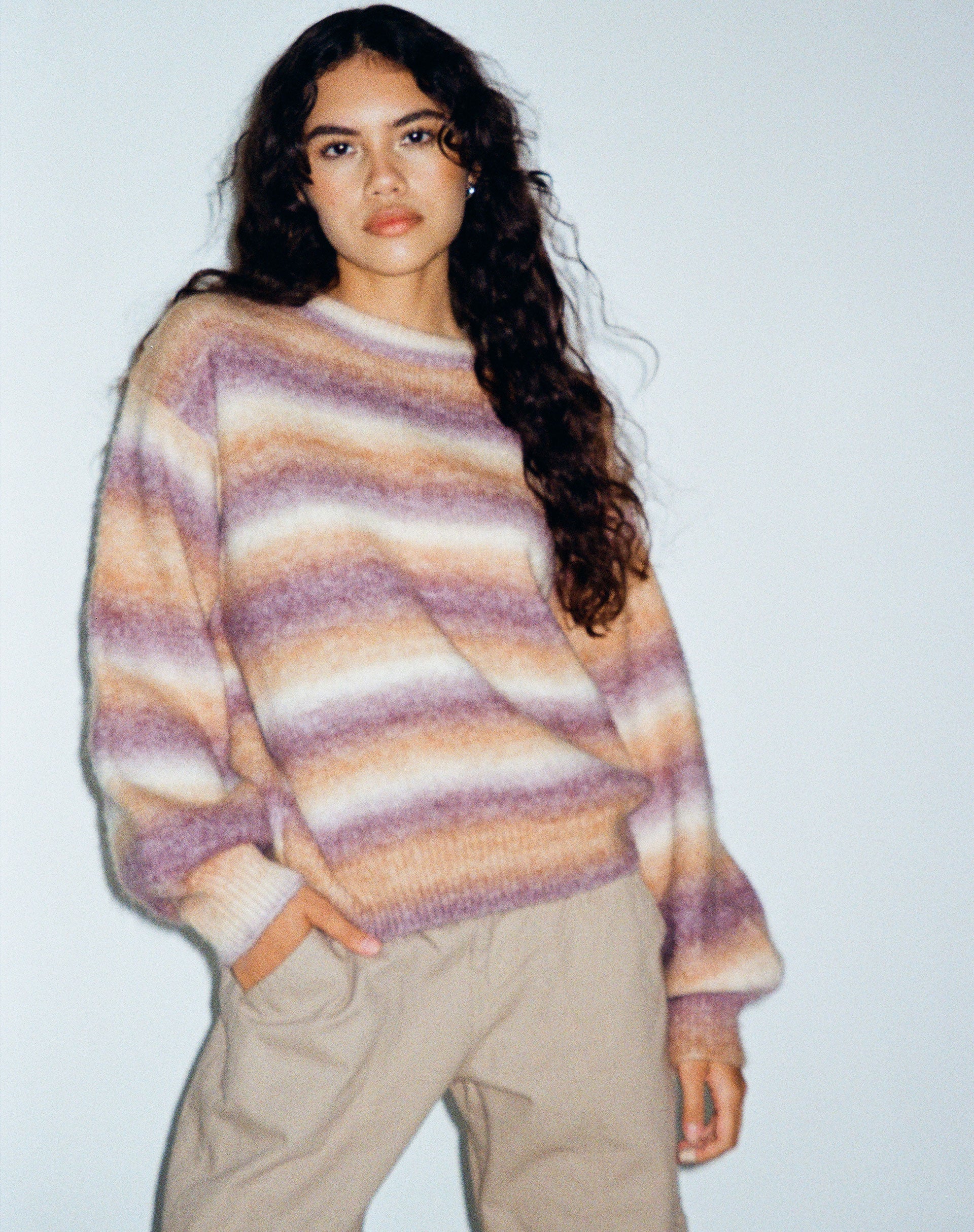 Stay cute and cosy on cooler summer evenings with our Ammaria jumper. In purple brown cream, it features a loose fit with long sleeves and crew neckline.