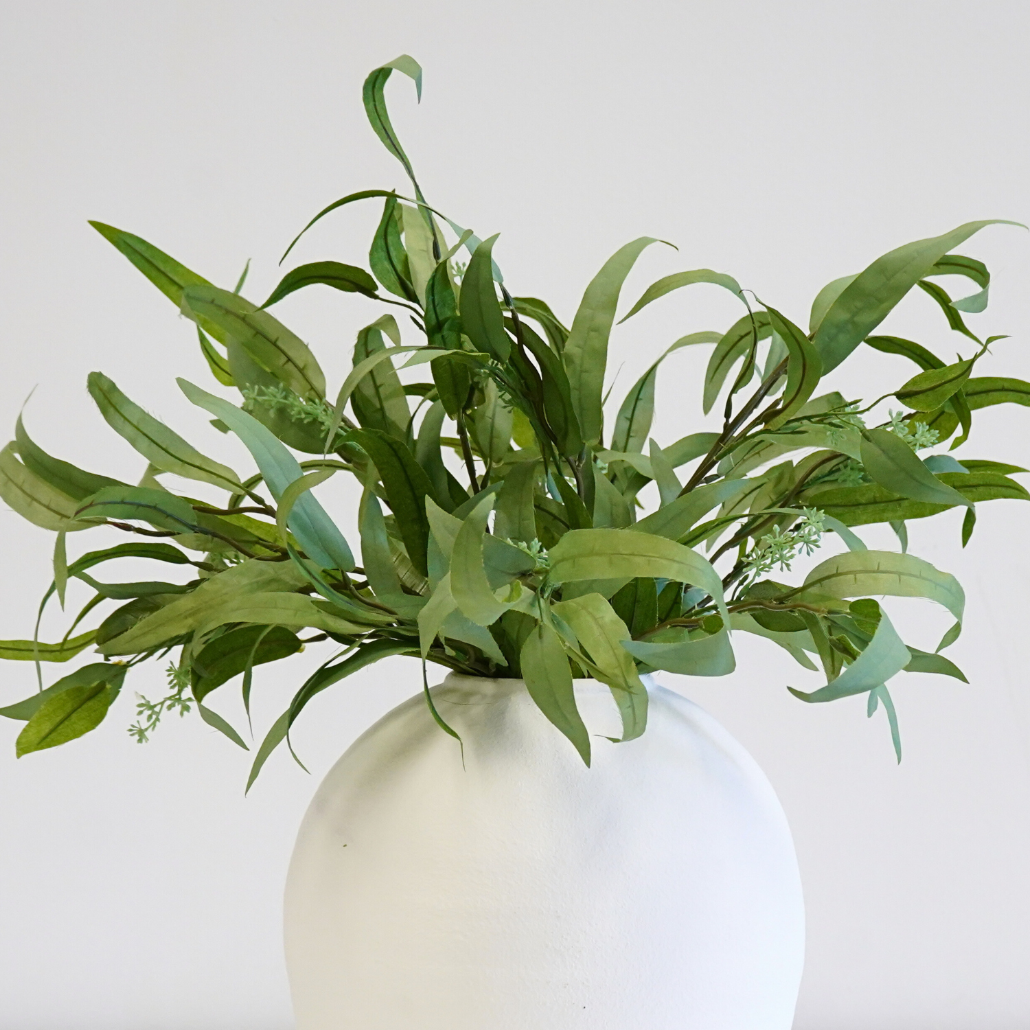 Bring the beauty of nature indoors with this realistic Artificial Eucalyptus Branch! Its bendable stem and soft silk leaves make it look exactly like the real thing. Plus, you'll never have to worry about wilting or browning leaves - it's a win-win! This branch is a perfect accent for an oversized vase, bunch multiple together to create a dynamic floral arrangement.