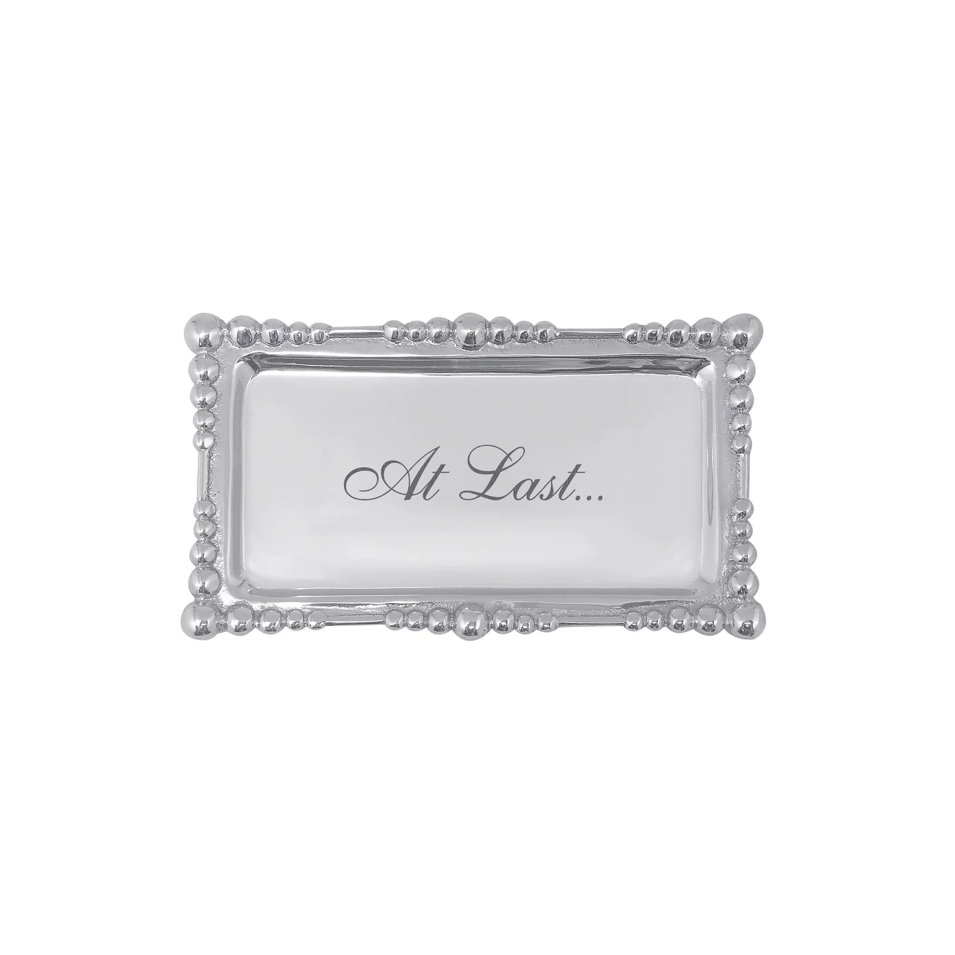 The "At Last" Statement Tray is for the moment you've been waiting for. Use it as a safe place for your jewelry, keep a message, or simply savor the moment forever. This silver rectangle tray is a functional piece with a beautiful shine and sentiment to it. Handcrafted and made of 100% recycled aluminum, it's the perfect piece for yourself or a special friend.