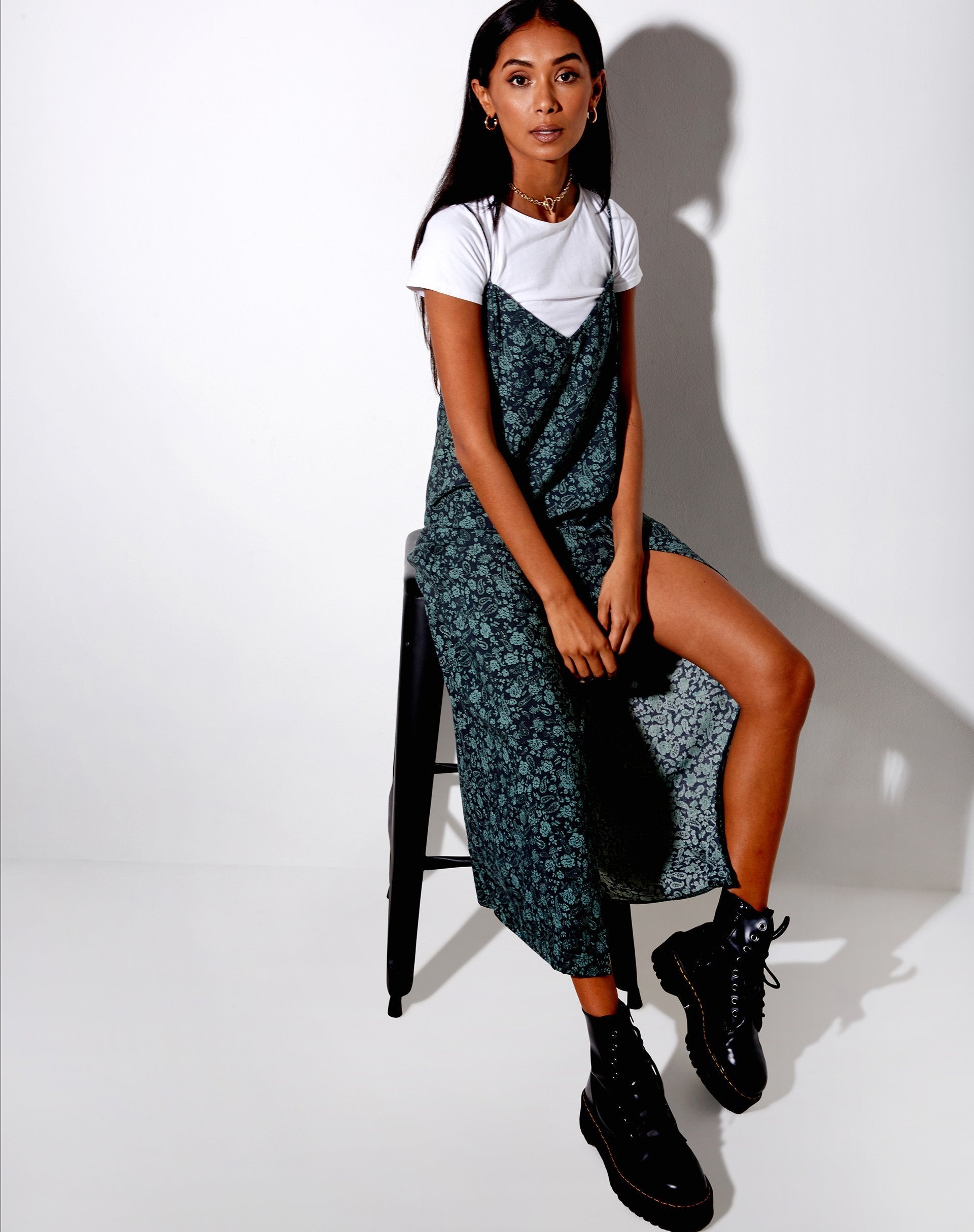 The Batis dress is how to do maxi's for the colder months. In a sage paisley print, it features a long slim fit with side split, spaghetti straps and v neckline. Layer it over a tee with a chunky boot.