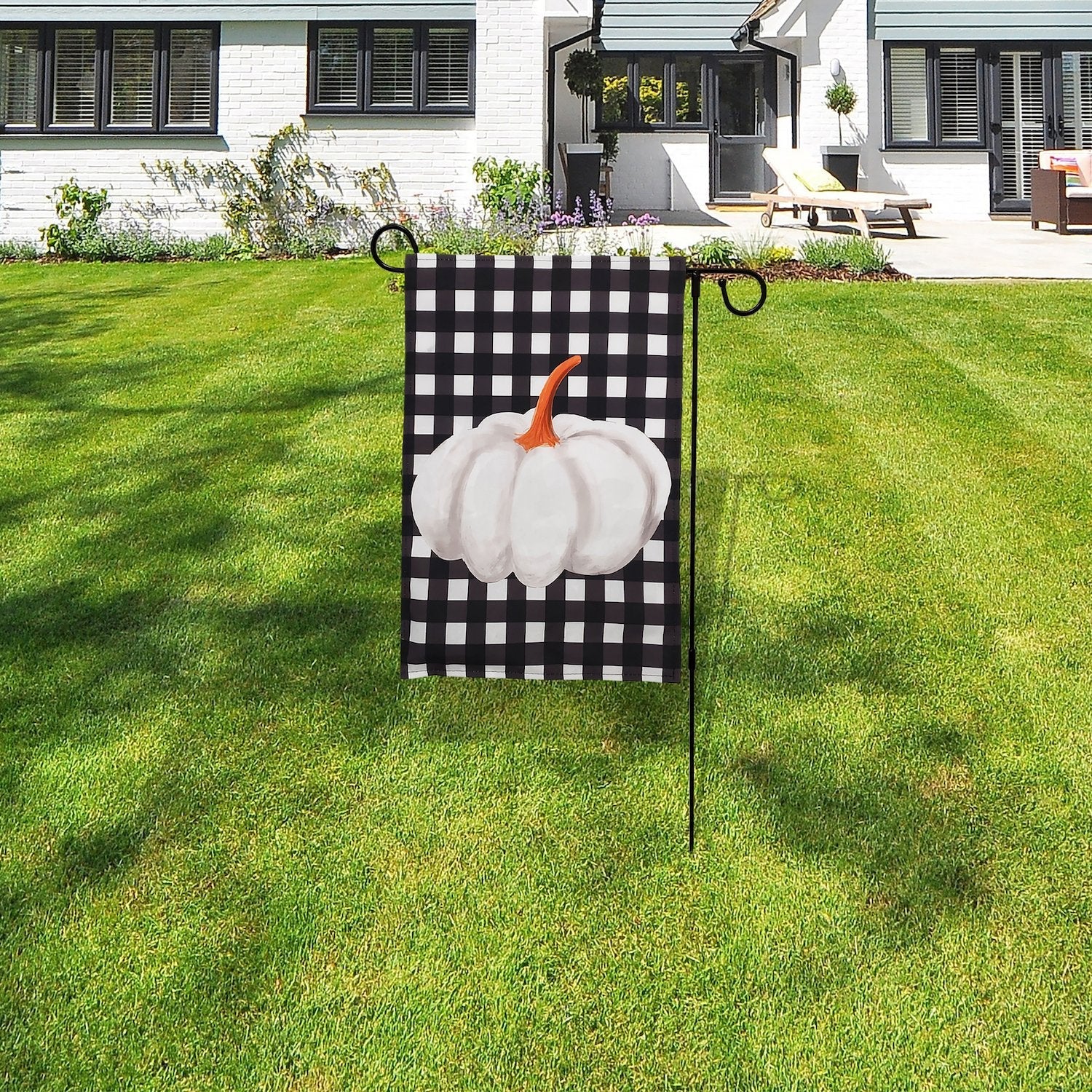 Decorate your home for autumn with the “Harvest” lighted outdoor banner hung from a garden flag stand. With the convenience of a remote control, the steady amber LED lights illuminate the trendy design of a white pumpkin on a black plaid background. Hang the banner from its metal stand and enjoy as the LED lights illuminate the design, creating a warm atmosphere to your outdoor autumn décor.