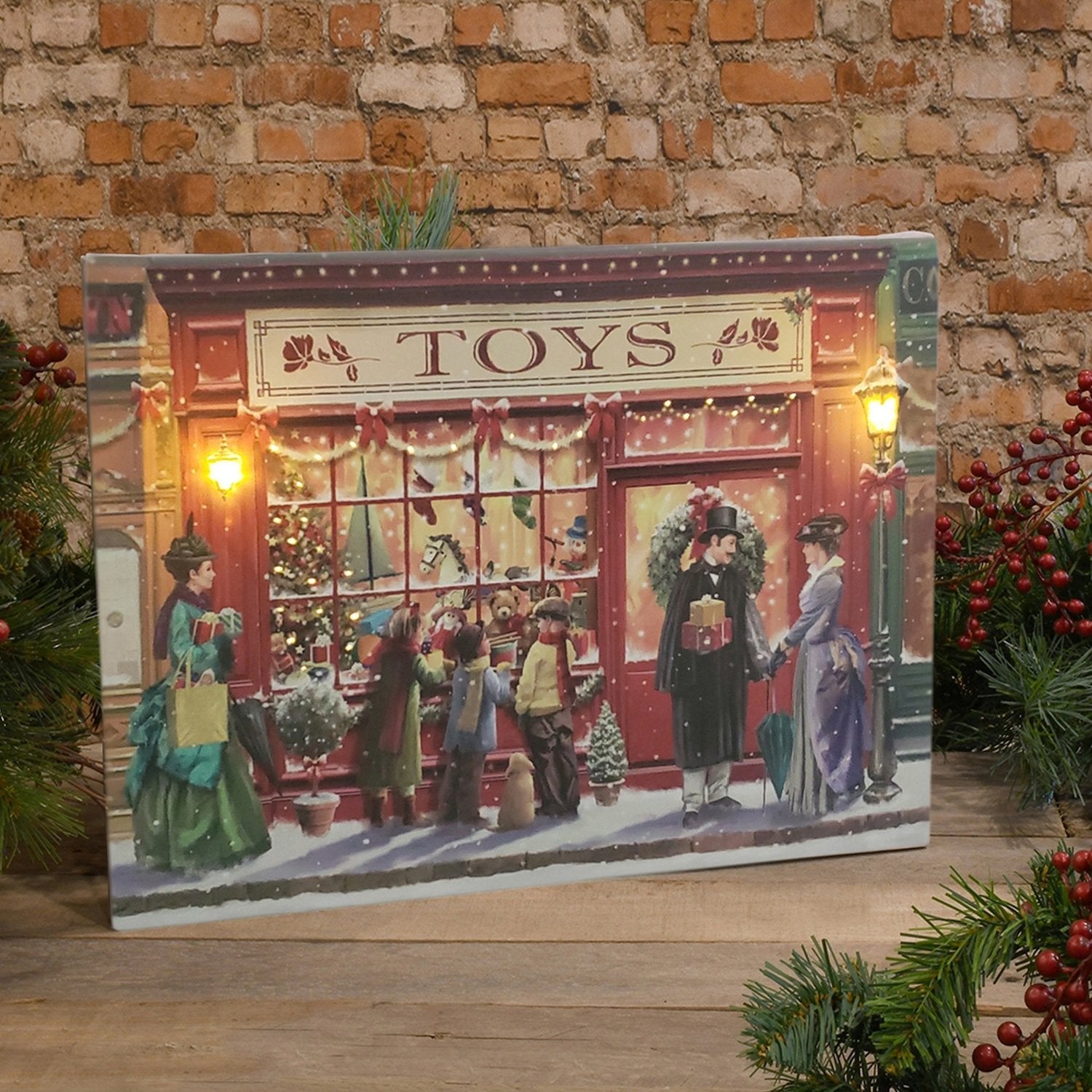 Decorate your home for the holidays with the “Victorian Holiday Shop” lighted wall art. The cheerful scene of children standing on a snow-covered sidewalk gleefully gazing through the windows of a decorated toy store while gift toting adults pass by will bring a sense of nostalgia as you remember holidays from years past. Remote controlled steady amber LED lights placed within the street lights and holiday tree illuminate the wall art completing your holiday décor.