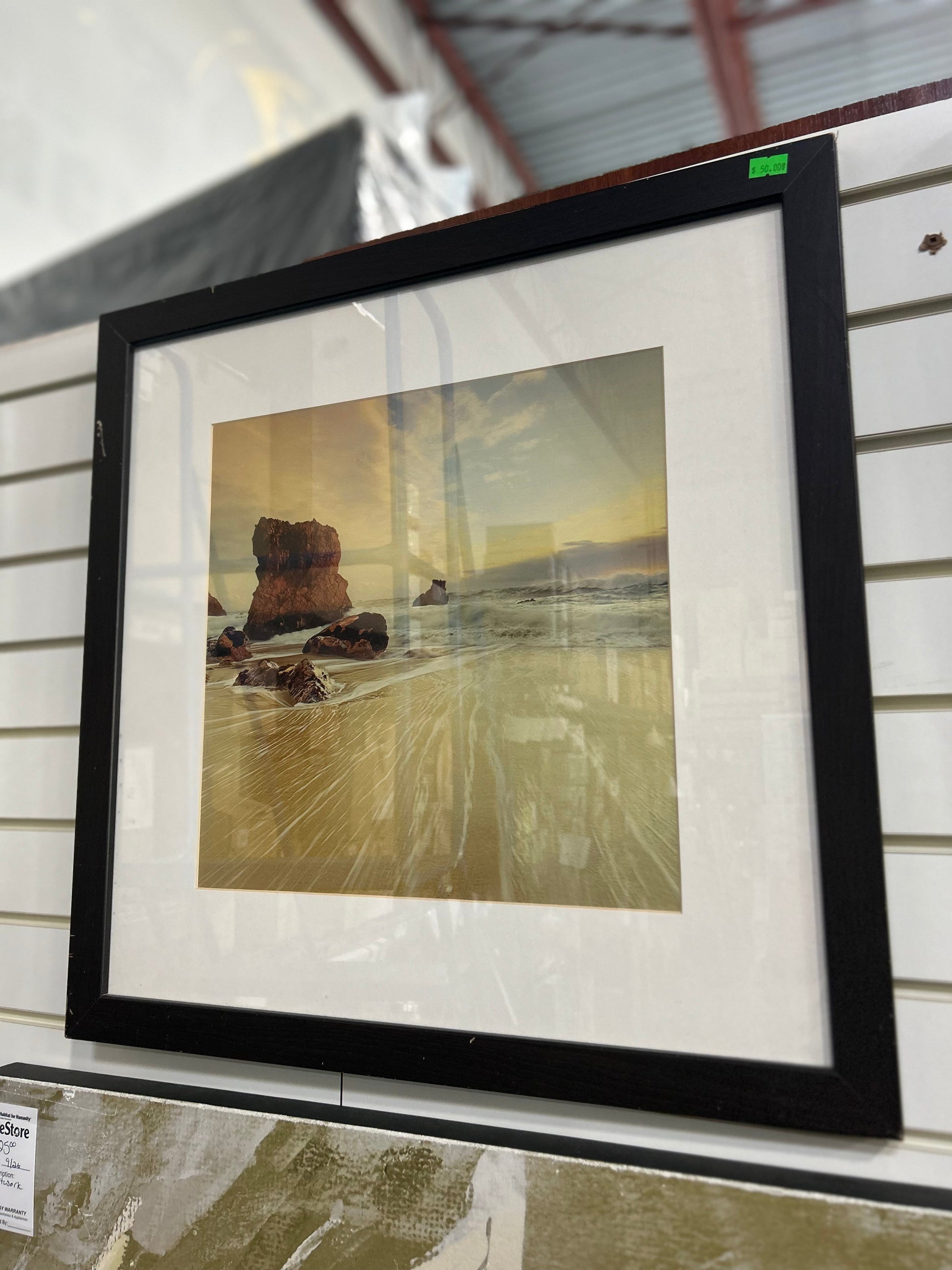 Description: The beach vibes are breathtaking in this serene framed beach scene. This would be a beautiful addition to any space. MM