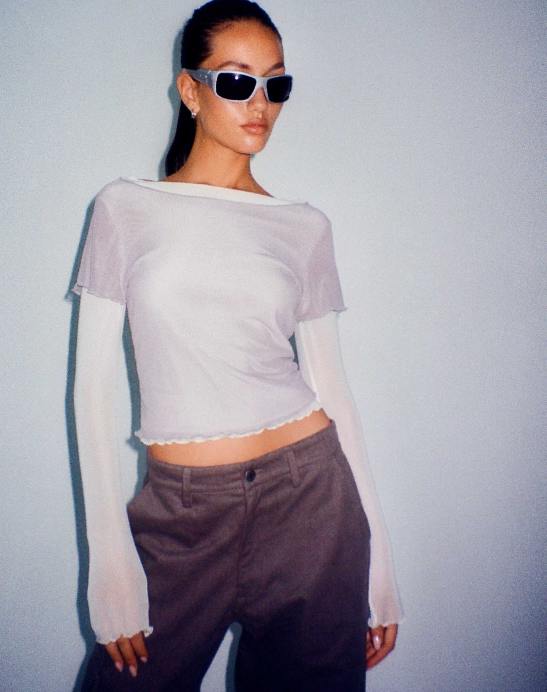 Bidara Mesh Long Sleeve Layered Top in Light Grey and Ivory