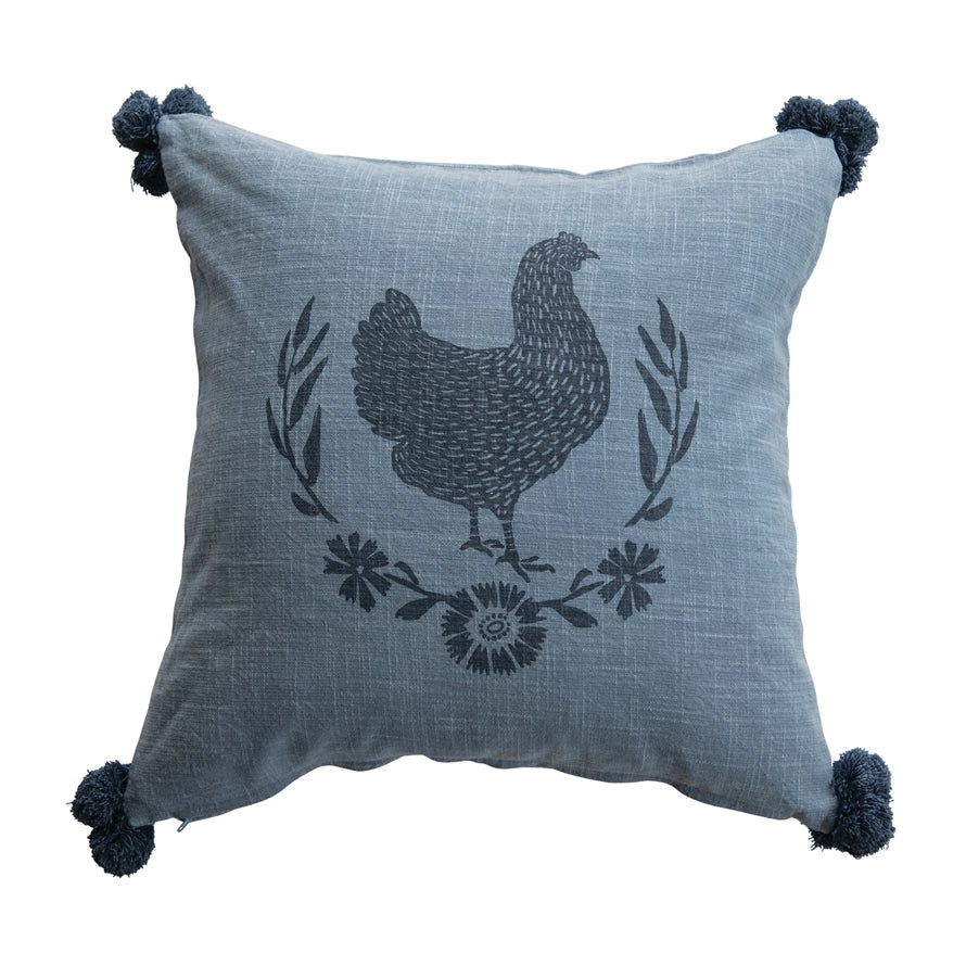 Enhance the charm of your Country-styled home with the delightful Blue Chicken Pillow. Crafted from soft and cozy cotton, this pillow exudes a beautiful blue hue, complementing any rustic decor. Adorned with an adorable chicken motif, it brings a touch of farmhouse warmth to your space. The pillow's whimsical design is further enhanced by pom pom detailing, adding a playful and inviting touch.