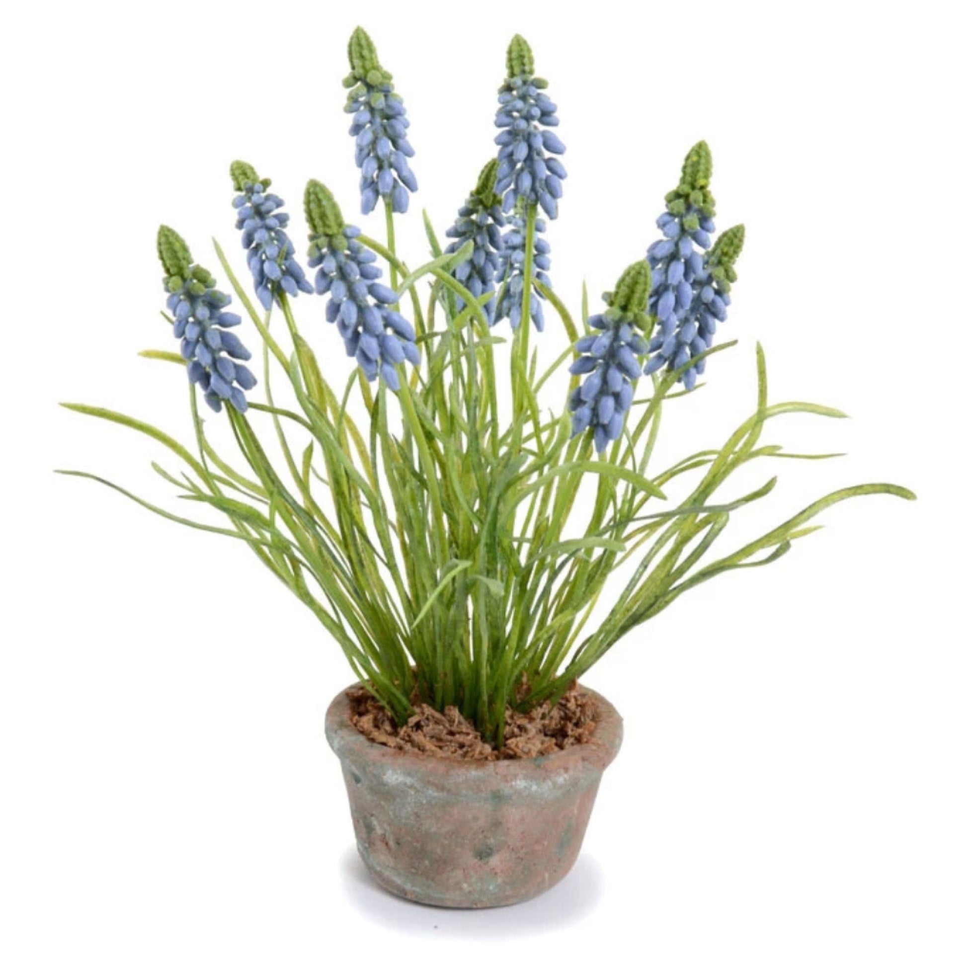 This arrangement, comprised of realistic Grape Hyacinth clusters, are arranged by hand in a hand-built terracotta pot with a signature faux dirt mixture.