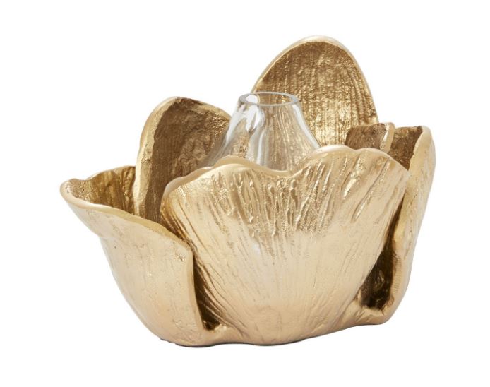 The Budding Flower Sculpture is an artfully shaped cast aluminium tulip with a glass budvase that rests inside the tulip's petals. Design beautiful fresh arrangements to layer into an Easter tablescape or style as a botanical decorative item.