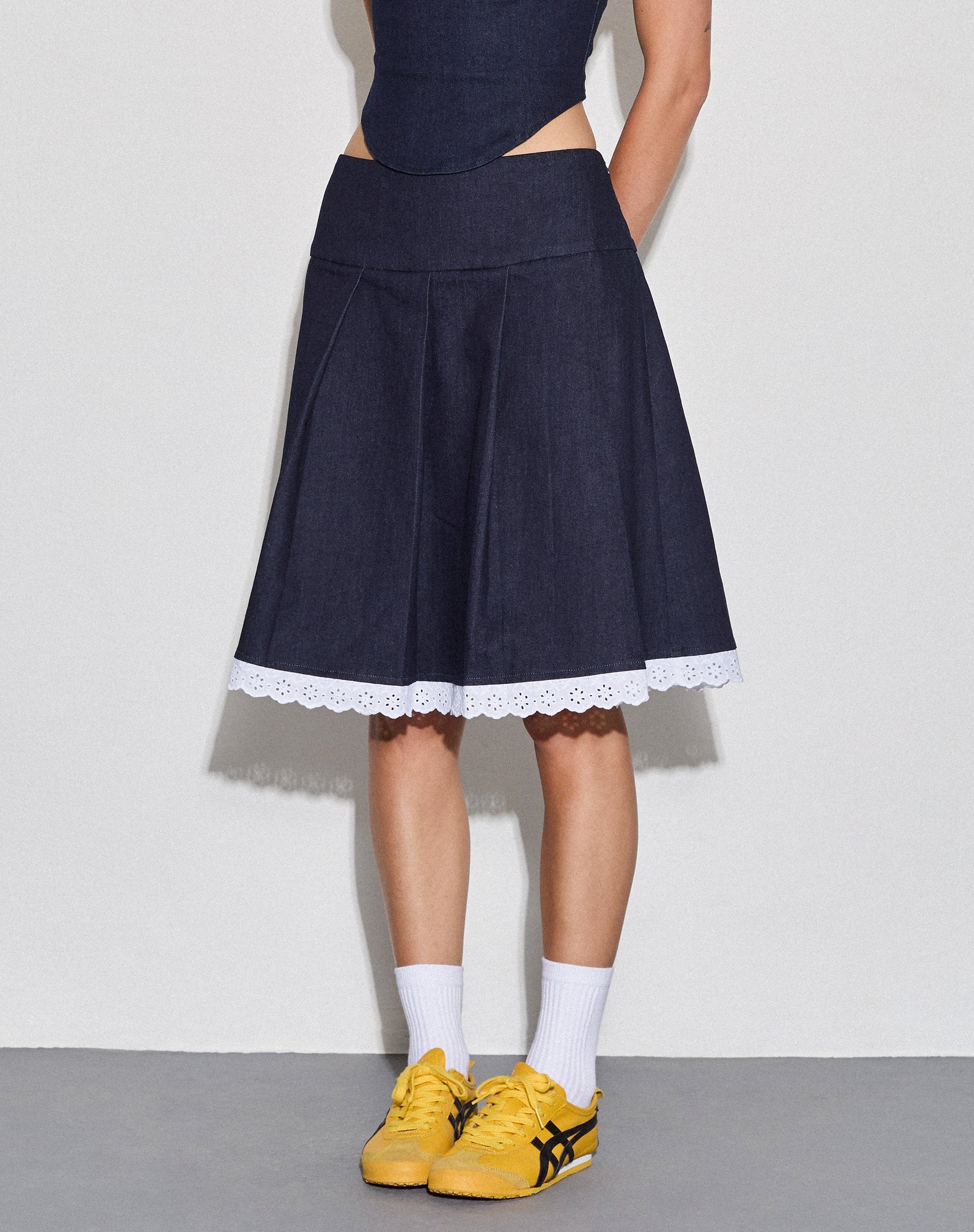 In an indigo chambray fabric, our Caralia skirt features a midi length hem with a low waistline and a flared, A-line fit with pleating. Finished with white broderie detailing along hemline Complete the co-ord with our Kayatra top.