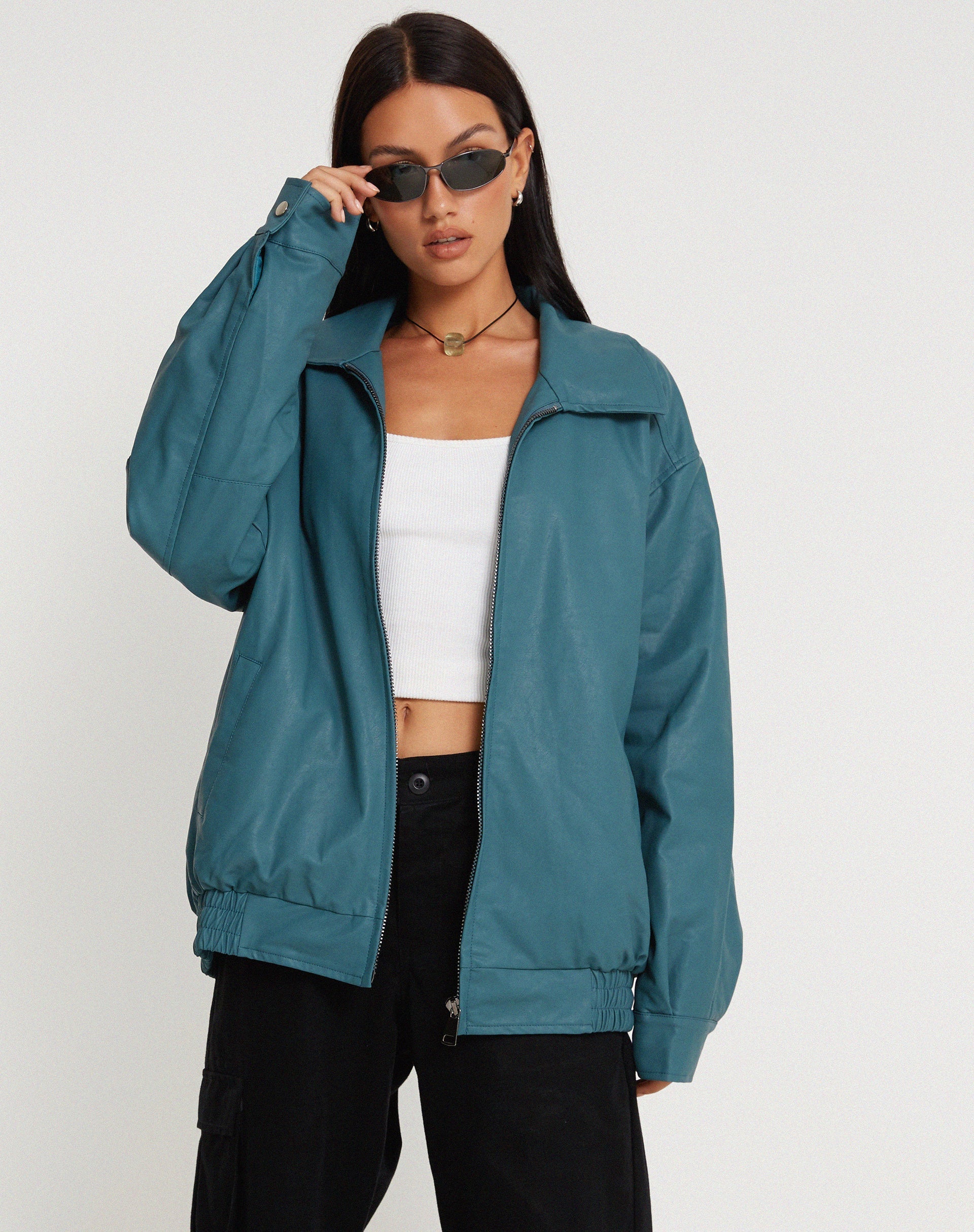 We are obsessing over the Cavita in PU grey blue. This jacket features an oversized fit with lapel collar and zip up front fastening.
