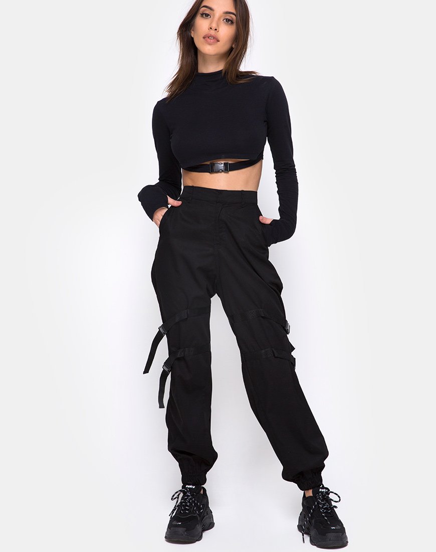 A cargo pant will give you all those bad ass vibes needed for a big impact! Attitude is everything with the Clive trouser, in black, they feature a hook and eye fastening with elastic cuff and buckle strap detailing. We love to wear ours with the Monec crop and chunky trainer.