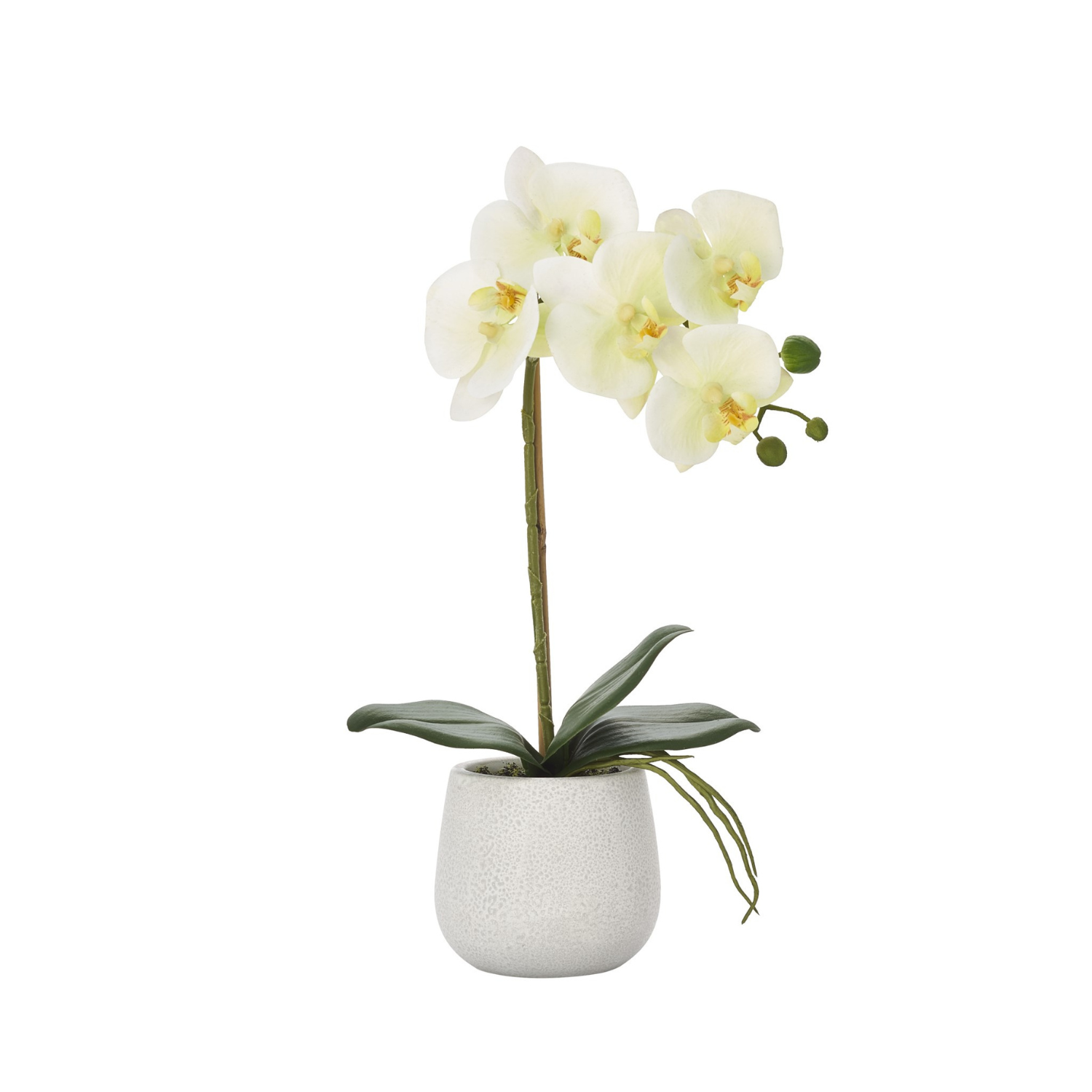 Brighten up your space with this lifelike faux potted Phalaenopsis Orchid plant. This handcrafted artificial flowering stem features meticulous attention to detail giving it a realistic look and feel. A great addition to your home decor, this orchid includes a modern ceramic pot and pretty yellow flowers to add a spa-like ambience to any room. It is perfect for the office as well, providing an easy-care solution for an entryway or welcome desk. Choose between a single or double orchid.
