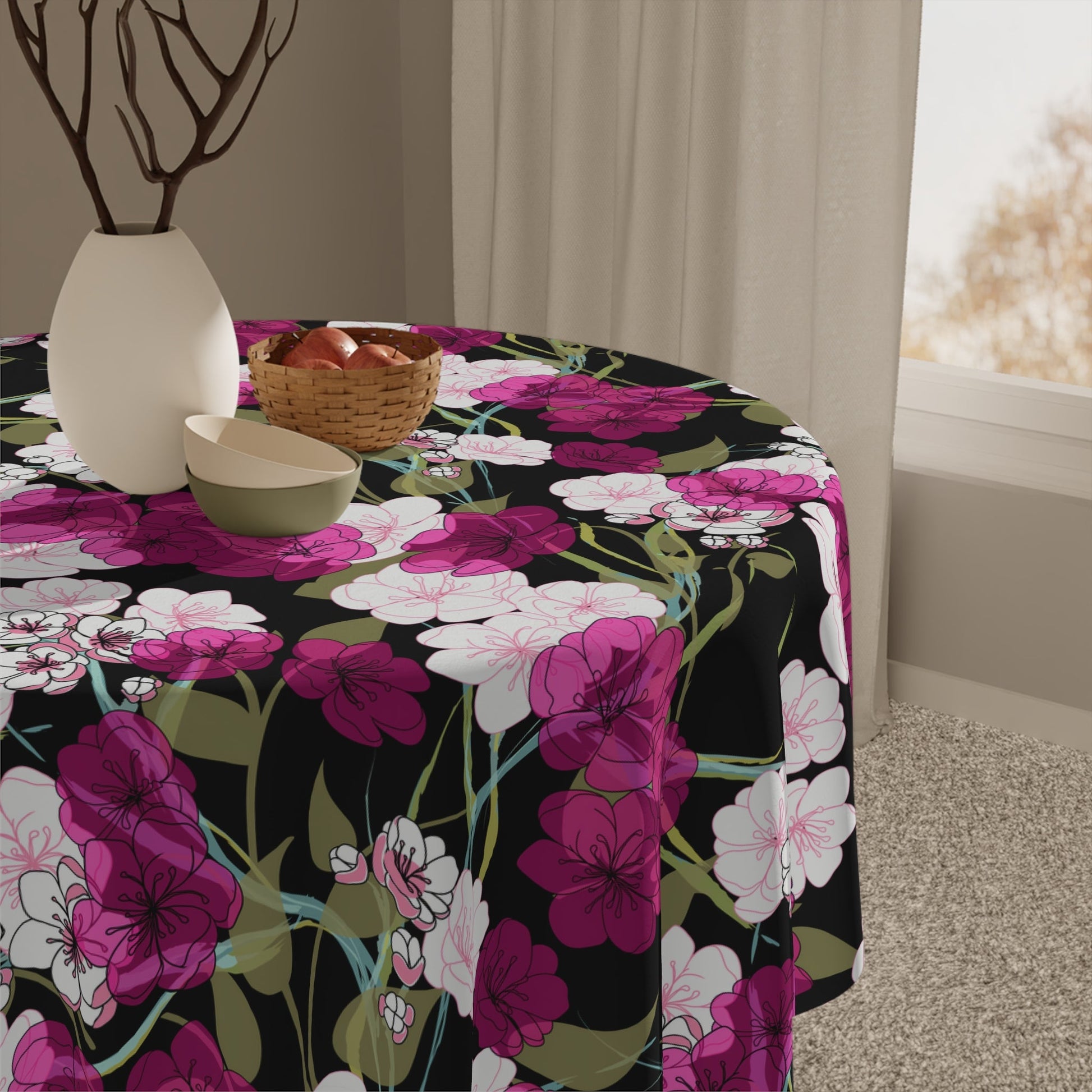 Enchanting Midnight Cherry Blossom Design: Embark on a journey through the night with our breathtaking tablecloth, featuring a striking midnight cherry blossom design. Magenta and ultraviolet blossoms dance against a backdrop of darkness, contrasted by lighter pink blooms and delicate fine lines. It's a stunning art piece that captivates the senses and ignites the imagination!
