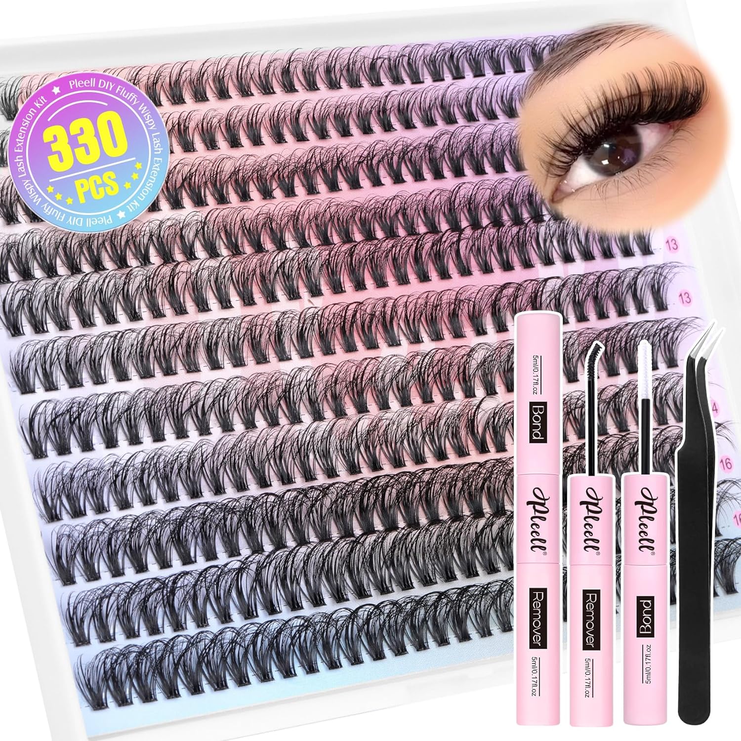 DIY Lash Extension Kit 330 Clusters Eyelash Extension Kit Fluffy Individual Lashes Natural Look with Lash Bond and Remover Lash Applicator 10-16MM Wispy False Eyelashes Clusters Kit by Pleell