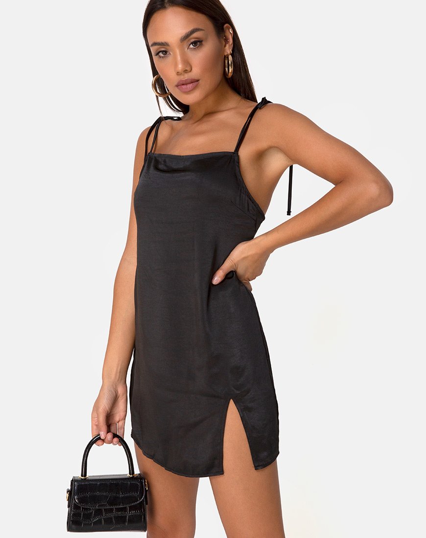 A LBD is a wardrobe staple so the doella dress is a MUST! It features a square neckline, thin straps with tie-up detailing, a low back, thigh-high side slit in a satin black fabric. Pair with black strappy heels for a classic but sexy look!