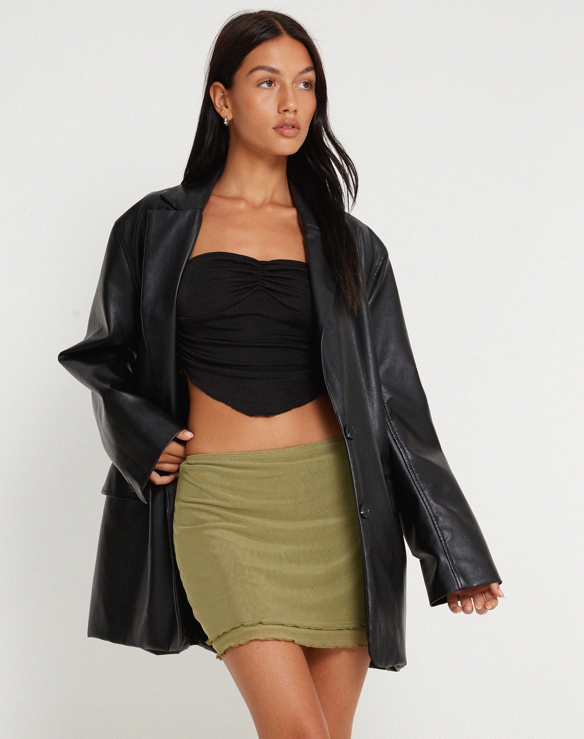 Mid-rise mini skirt in a olive mesh material. Features a double layer design and lettuce hem. Complete the look with the Hankru top.