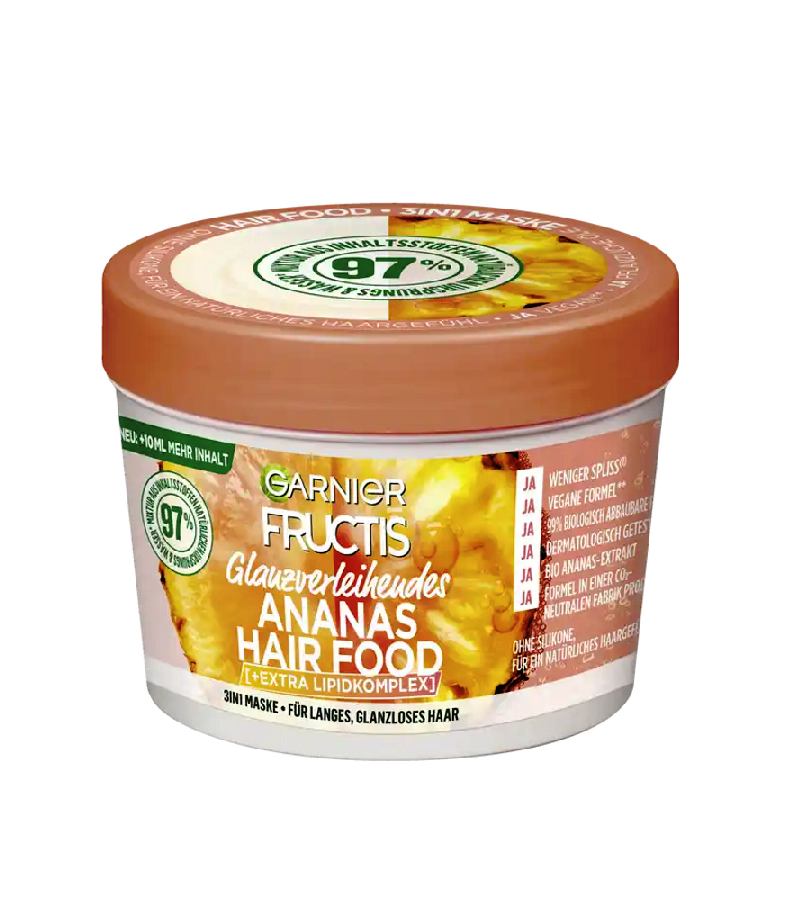 The Garnier Shine-Infusing Pineapple Hair Food 3in1 Mask is specially tailored to the needs of long, dull hair. Thanks to organic pineapple extract and an extra lipid complex, the 3-in-1 hair mask provides intensive care, ensures more glow and counteracts split ends. In addition, the mixture is made up of 97% ingredients of natural origin.