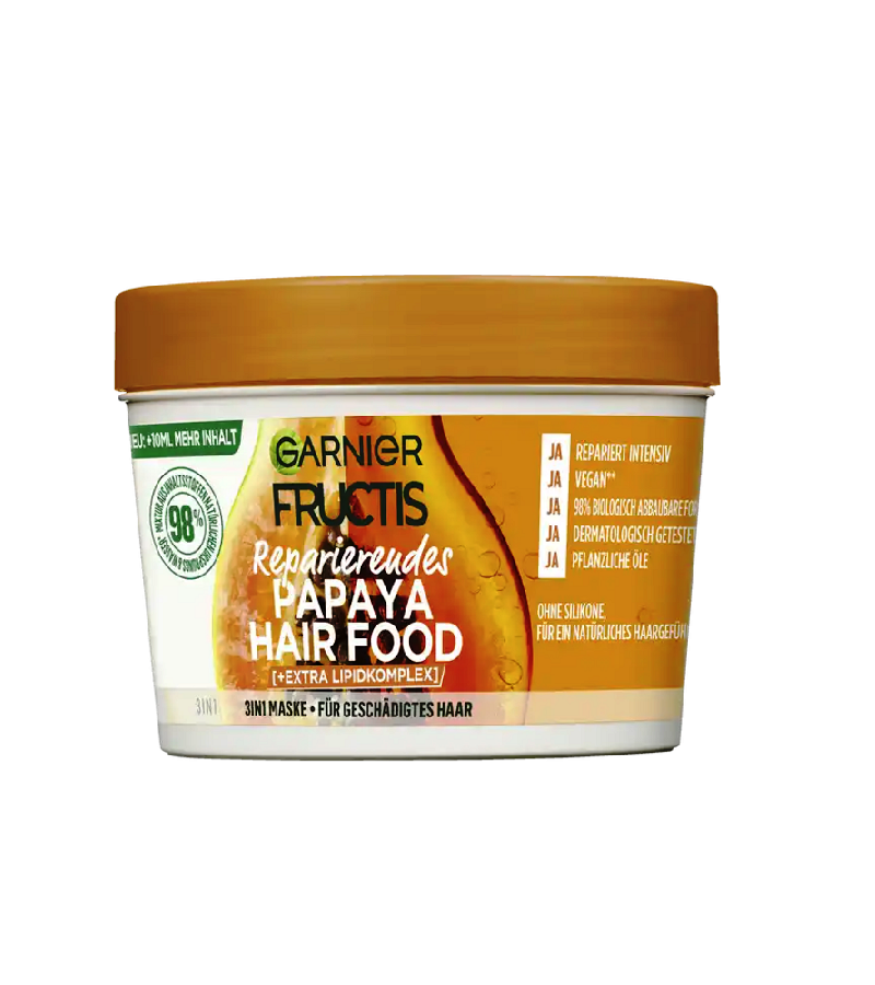 Craving for no-frills hair care? The Garnier Fructis Repairing Papaya Hair Food is more than just hair care. It pampers damaged hair with intensive care that can be used in three different ways. Specially developed for damaged hair, the papaya-enriched formula repairs the hair and gives it more suppleness. Depending on your individual needs, the creamy 3-in-1 care can be used as a conditioner, mask or leave-in - just as your hair needs it. The wonderfully light texture of the hair food is absorbed immediately and intensively nourishes hungry hair without weighing it down. And best of all: The Garnier Fructis Repairing Papaya Hair Food is vegan and consists of 98% ingredients of natural origin.