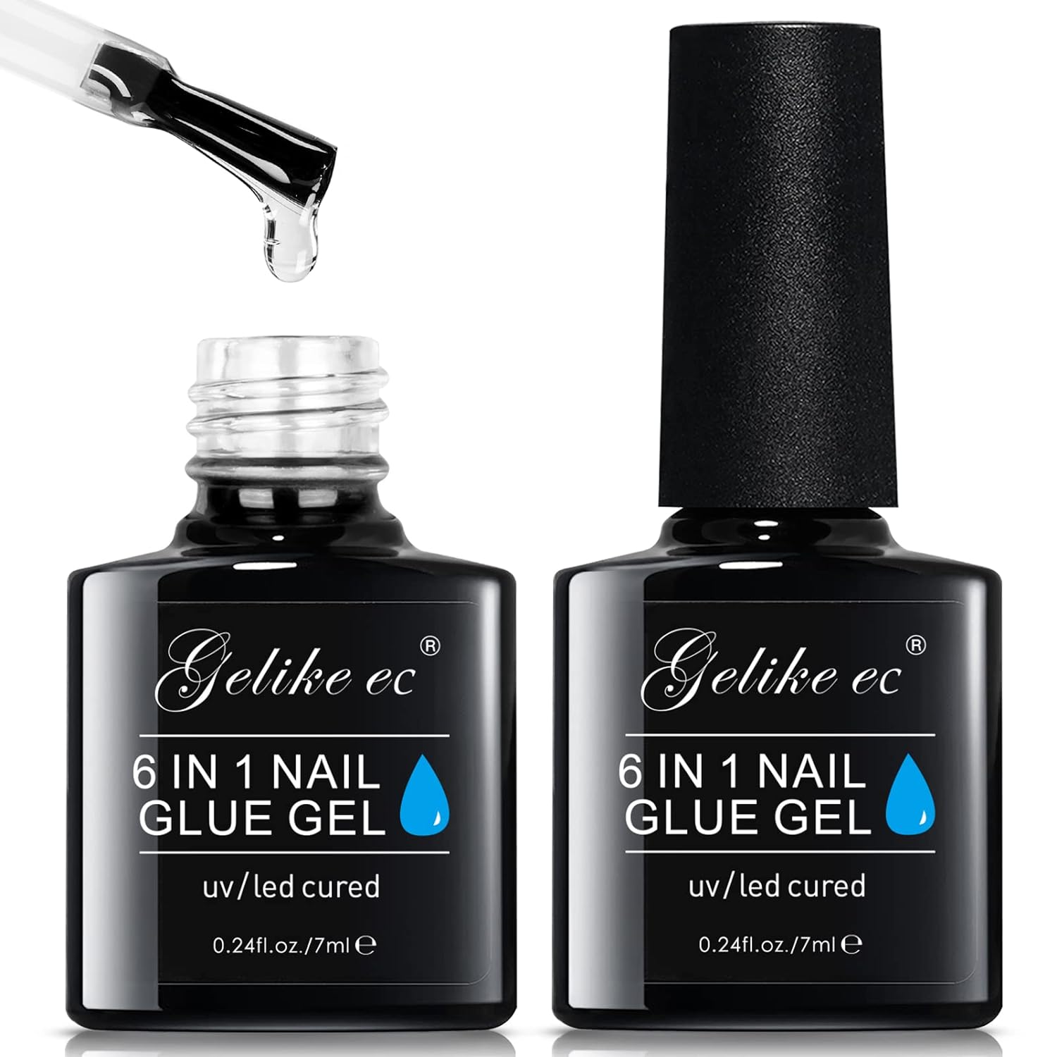 Gelike EC 2Pcs Nail Glue Gel 6 in 1 for Acrylic Nails Long Lasting, Curing Needed UV Extension Glue for False Nail Tips and Press on Nails, Nail Repair Treatment