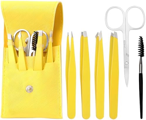 GEMGIMY 6 PCS Eyebrow Tweezers Set with PU Case, Complete Eyebrow Grooming Kit with 4 Tweezers, Scissors, and Brush