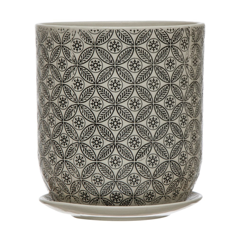 6" Round x 6-3/4"H Hand-Stamped Stoneware Pot & Saucer w/ Embossed Pattern