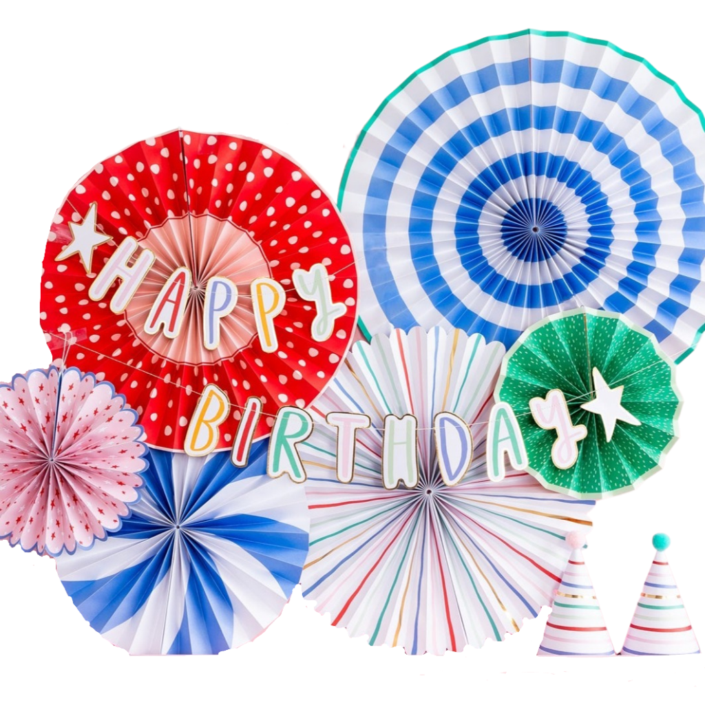 Create a day of whimsy and fun with Oui Party's bright and colorful Happy Birthday Party Fans. Designed with gold foil accents and delightful patterns this party fan set is the perfect addition to a birthday celebration for your loved one!