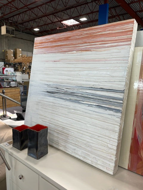 Description: It's a sunrise, it's a bullet train, it's an abstract painting with bronze, red and black streaks across a white background.