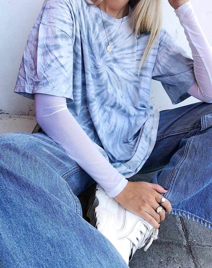 Loving tie dye? So are we! The oversized basic tee, in a grey tie dye features an oversized fit with crew neckline and short sleeves. Pair with our black mom jeans or cycle shorts for a casual everyday look!