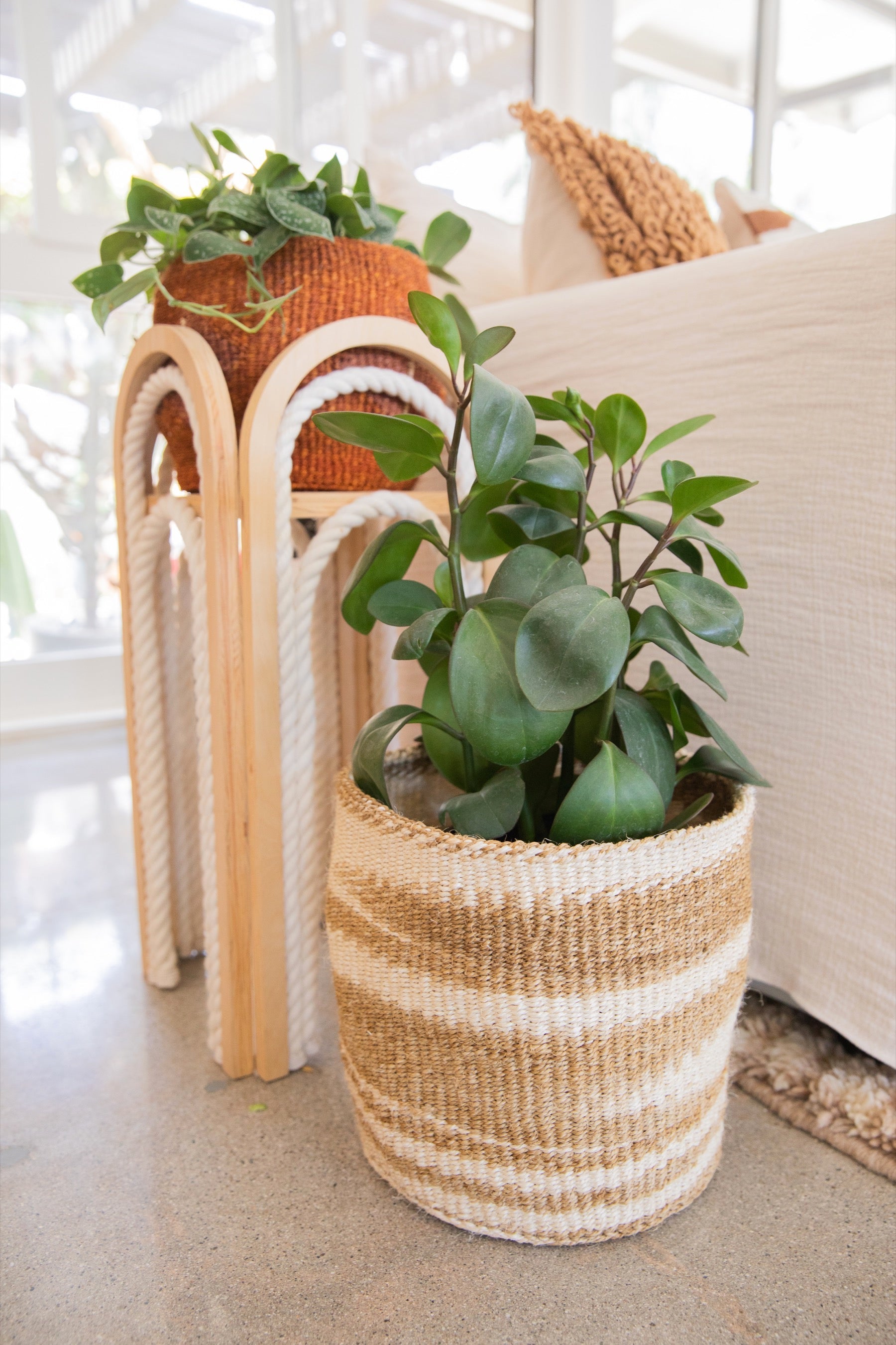 These sisal, woven baskets are handmade by a weaving cooperative in southeastern Kenya. They are naturally dyed using soot, lending to a unique variation in tone with each one. The pattern also varies from piece to piece, as each weaver has their own technique. These African baskets are great as plant holders, catchalls, toy baskets, storage baskets, or to liven up a space!