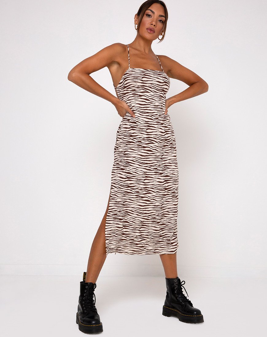 Ease your way into this season with the easy tiger print Mirzani dress. Not only does it come in a striking animal print, along with its strappy backless detail and fierce side split. Dress this look down with a leather jacket and some docs for that rock chick kind of feel.
