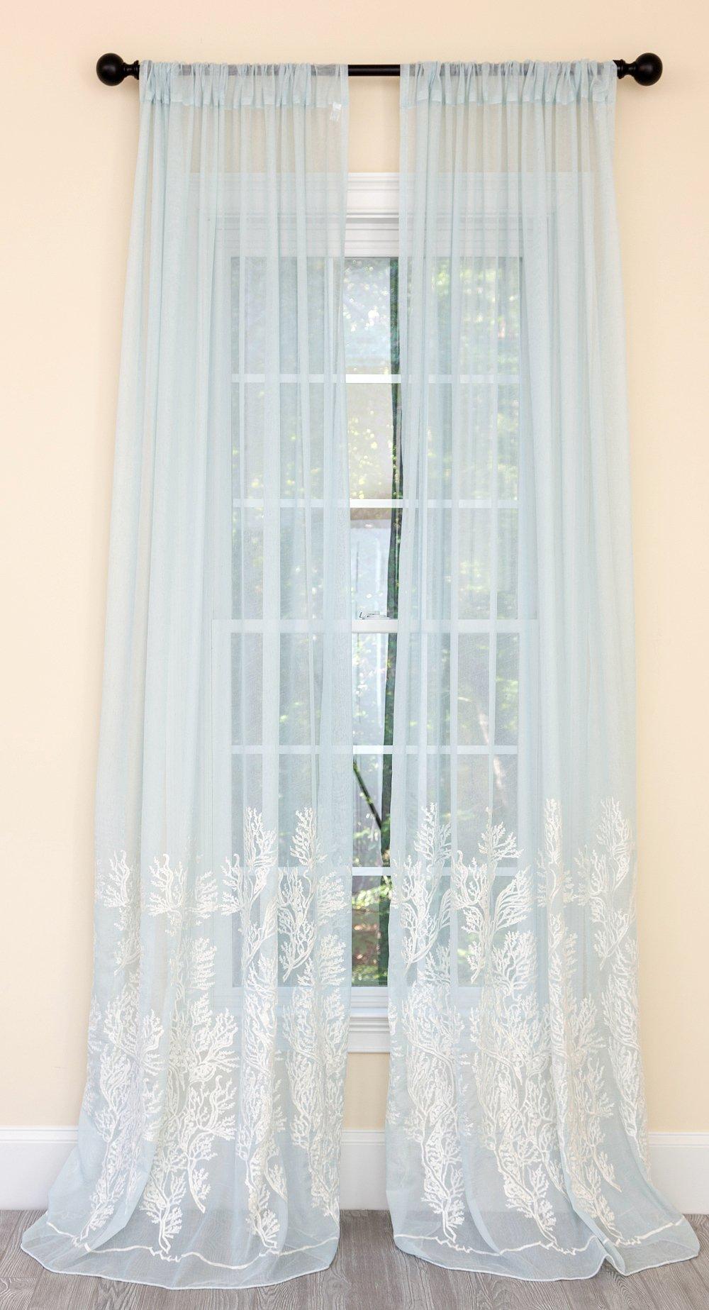 Vivid ocean coral embroidered on lightweight aqua blue Sheer fabric. This beautiful curtain adds a refreshing charm to your window and lets in beautiful diffused light. Bring a feeling of being in the ocean.