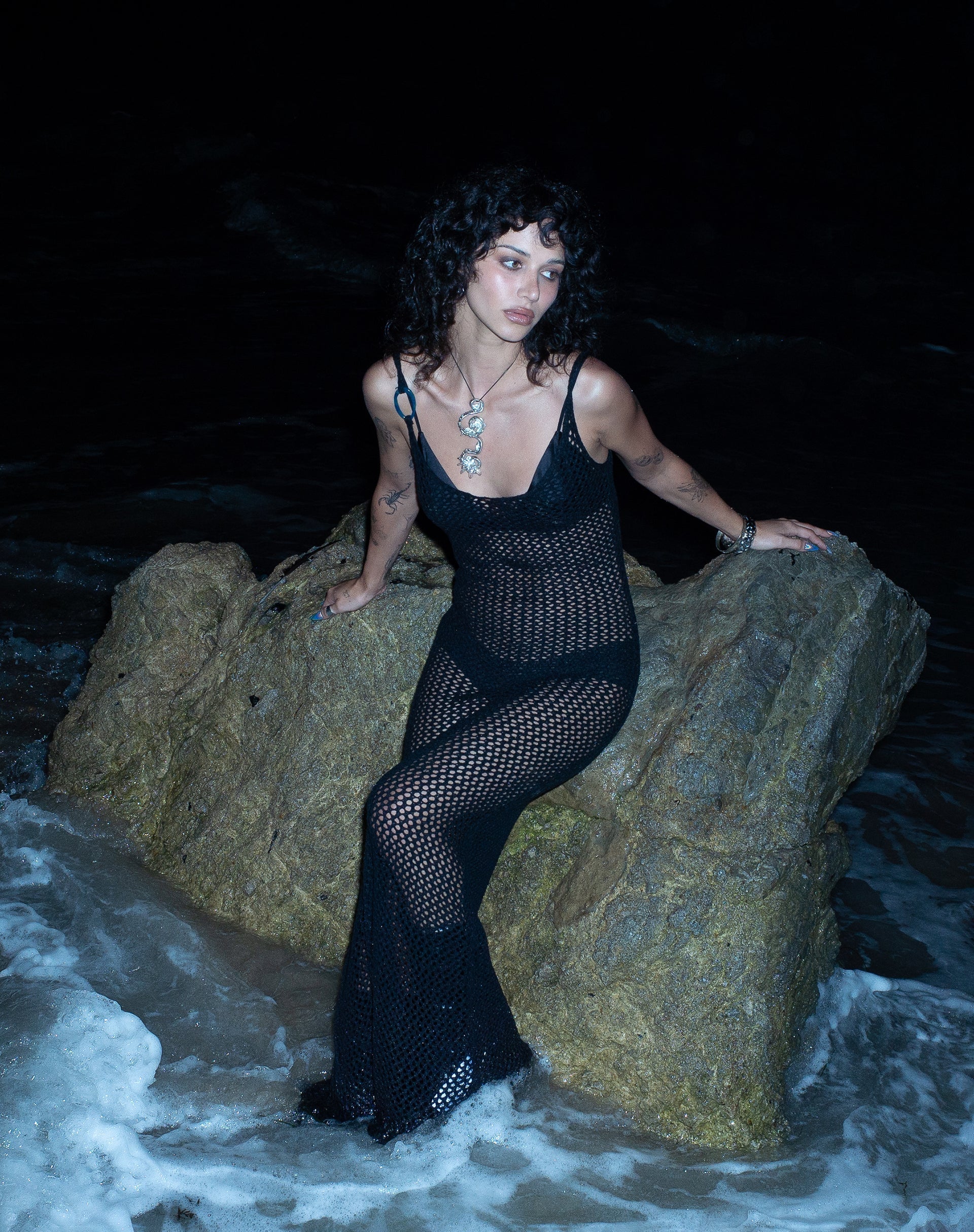 In a black open knit, our Nazir dress features a bodycon fit and thick straps with an o ring detail in a maxi length.