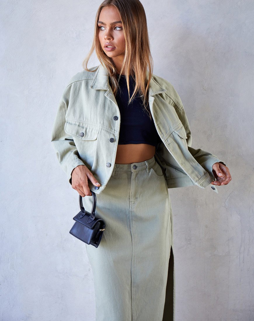 Get ready for the cooler months with the noma jacket! In a sage green this features a button up front and button detailing on the sleeves. Pair with our matching Lyra Skirt in Sage and white trainers for a casual chic look!