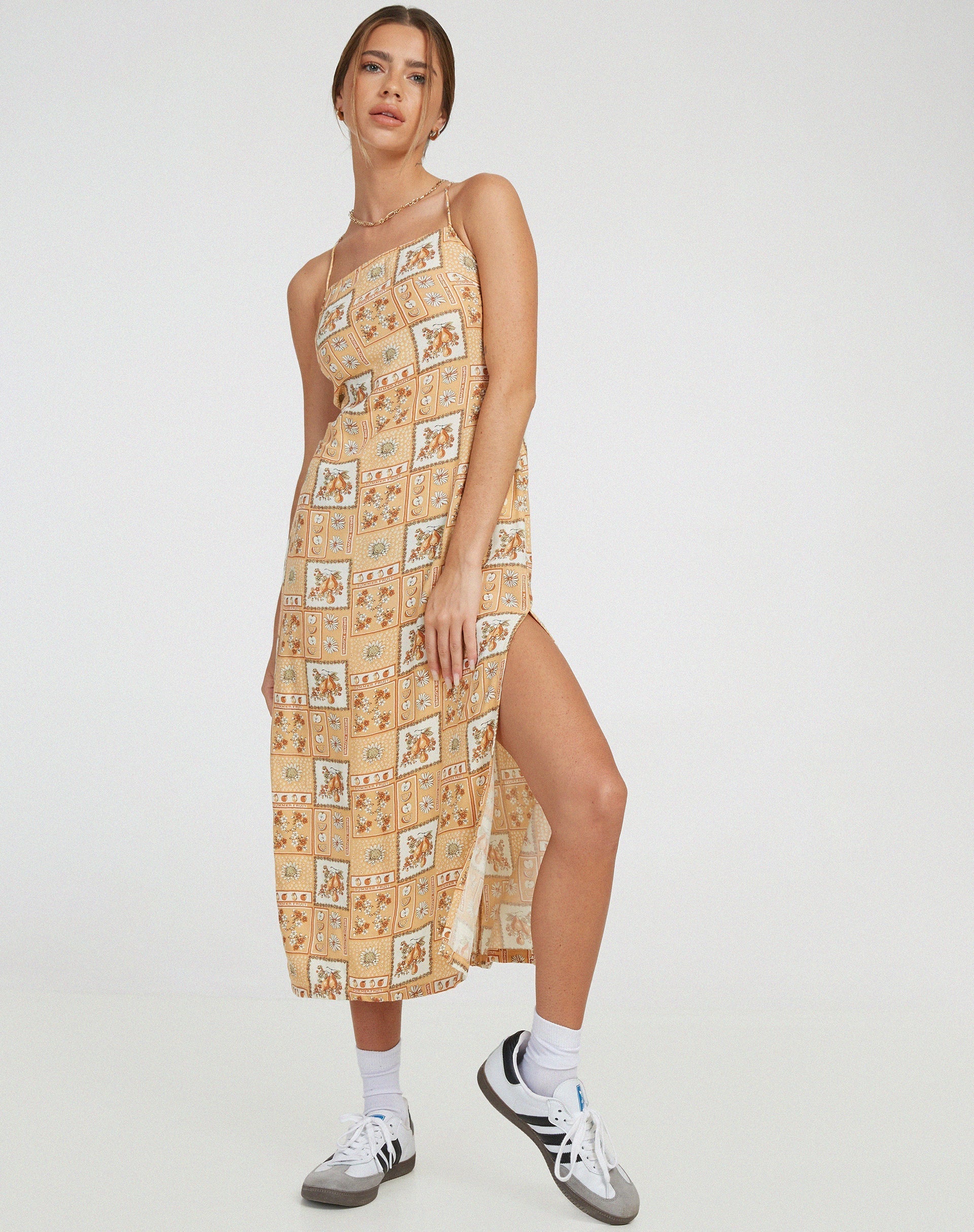 Work some brown prints in to your OOTD with the Nosita dress. In a brown print, it features spaghetti straps with a square neckline and a midi fit with a side split. Pair with your fave shoes.