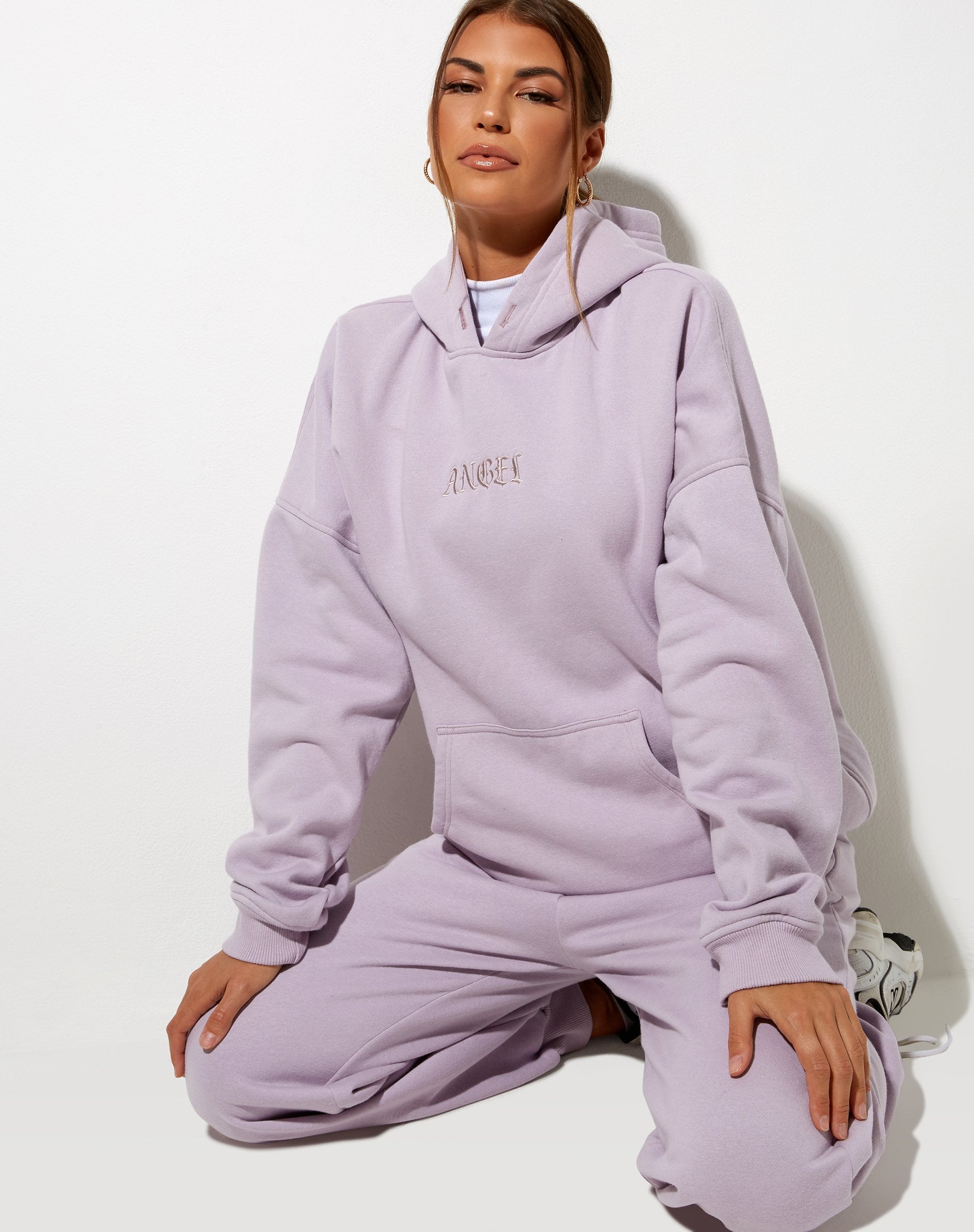 Our Oversize hoodie ensures everyday comfort. In violet, it features a hooded design, front pocket, and a loose longsleeved fit with 'Angel' embroidery on the front. Wear with our matching Roider joggers for a comfy co-ord.