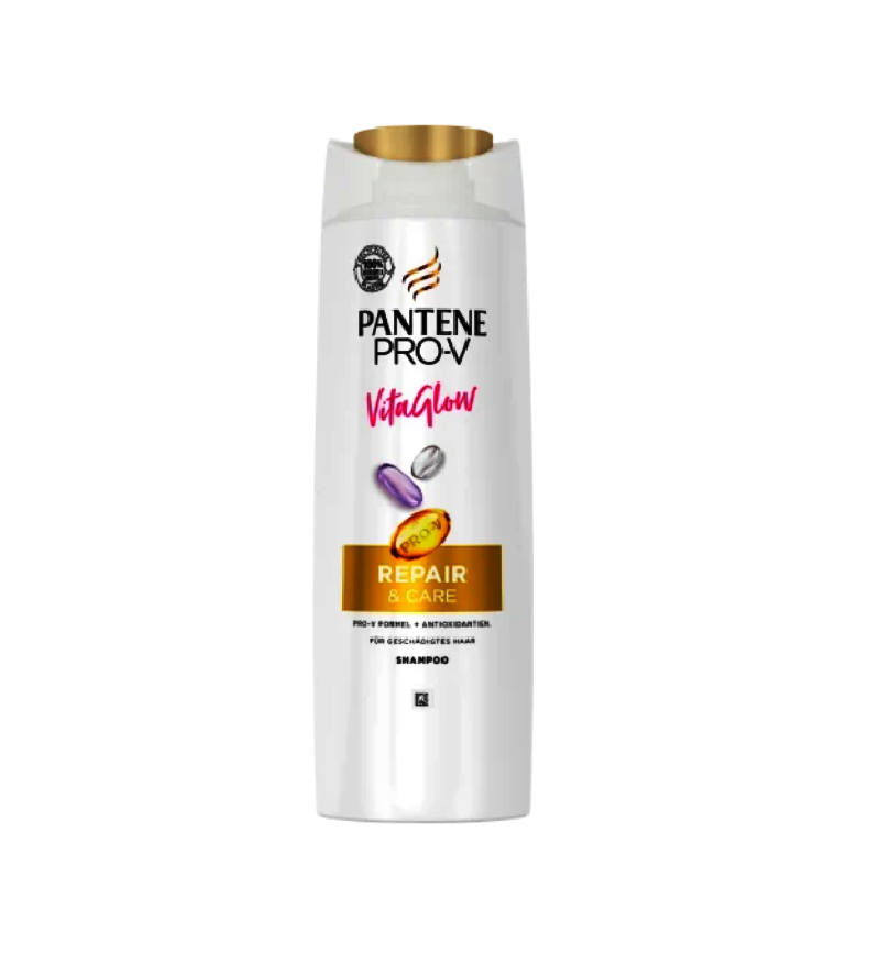 The PANTENE PRO-V VitaGlow Repair & Care Shampoo gently cleanses and provides the hair with active Pro-V nutrients. The shampoo immediately fights signs of hair damage for suppleness and shine in damaged and dry hair. *Packaging contains at least. 70% recycled content.