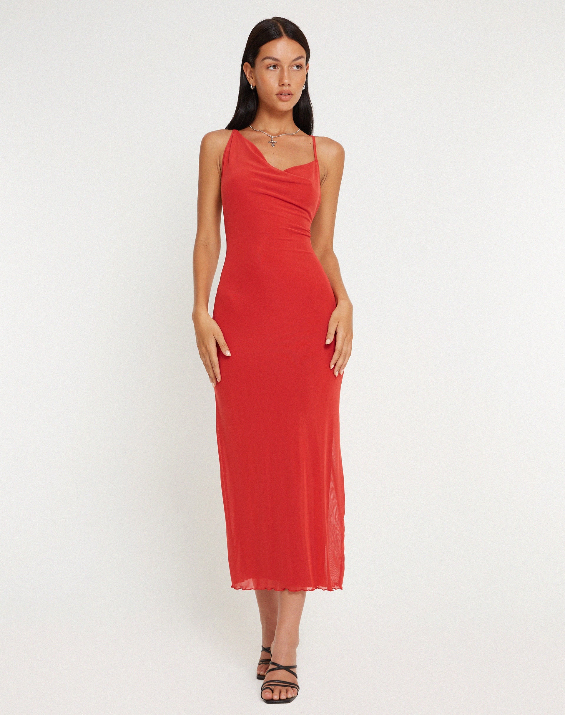 Slinky midi dress in red clay, with a cowl neckline, thin asymmetric straps, and a lettuce hem