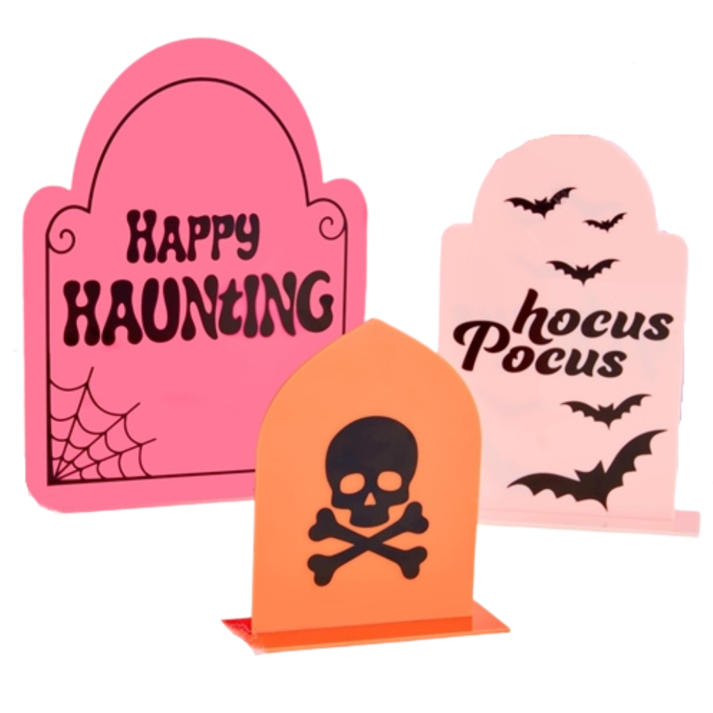 Add a pop of color to your Halloween home decor with these Pink Acrylic Tombstones. Each set includes 3 acrylic pastel Halloween tombstone decorations in large medium and small sizes.