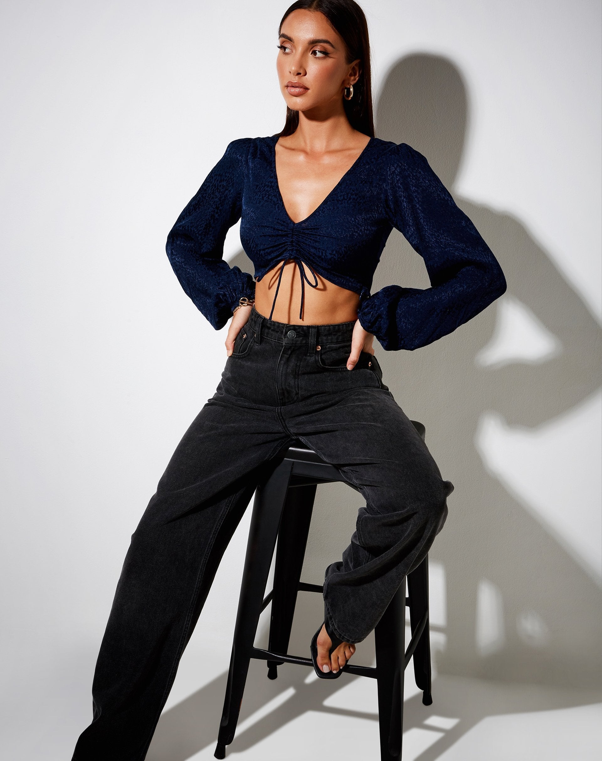Subtle animal print is still a vibe. Our Reilo top comes in a satin cheetah navy design and features a cropped fit, v-neckline, long balloon sleeves, and a ruched front with bow detailing. Style with some jeans, strappy barely there heels, and some hoops to complete.