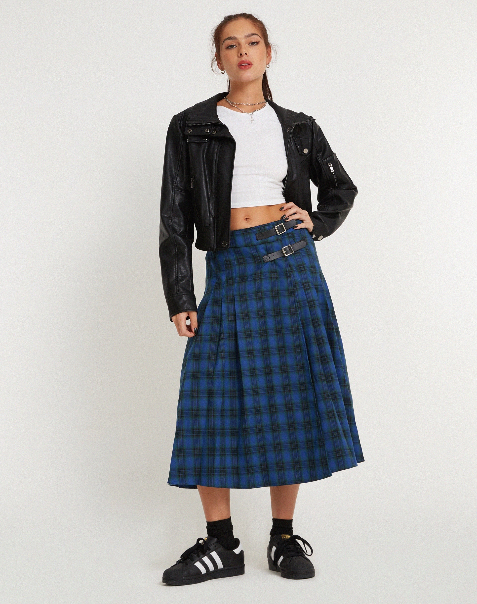 A look you need this season! The Rigifa skirt, in tartans blue grey, features a midi, high waist fit and buckle detailing. We love to pair with a white tee and our Loviana jacket.