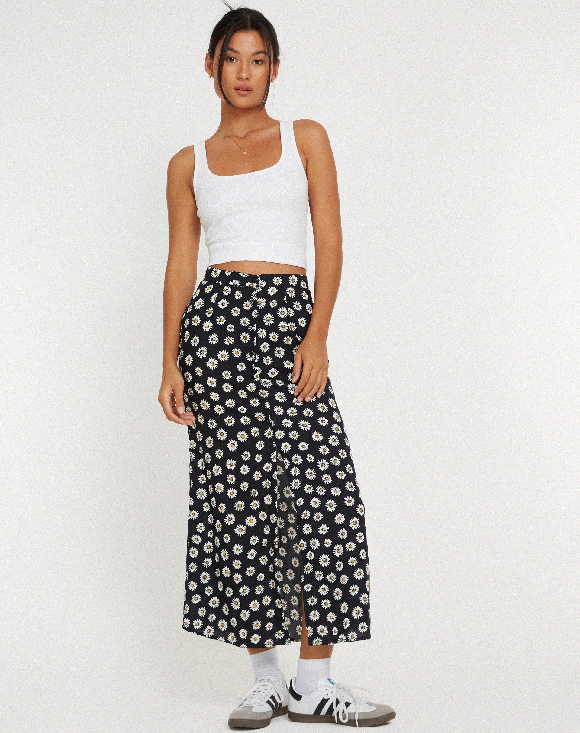 Florals are here to stay so opt for the Rima skirt. Featuring a midi length, high waist with button detailing and a centre split in a black and yellow daisy print. We love to pair ours with the Roxe top.