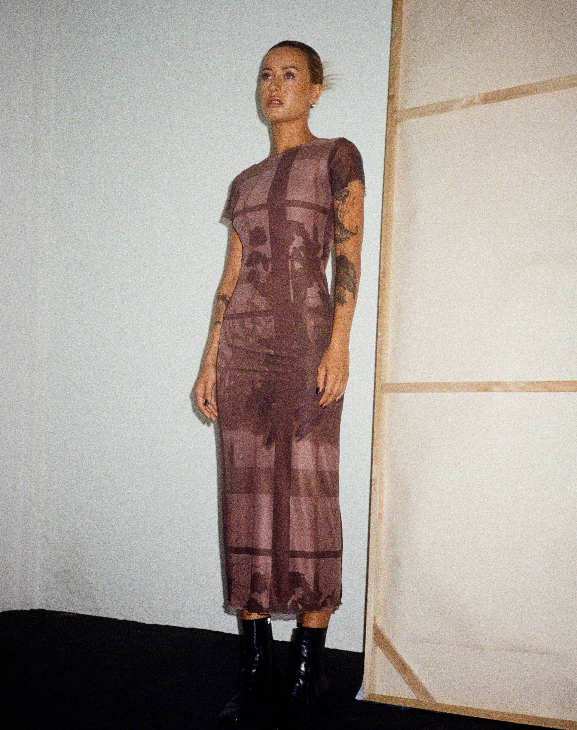 Our Roska dress is the perfect addition to your wardrobe. Featuring a midi, bodycon fit with short sleeves in a brown photo print. Add a heeled boot for a day or night look.