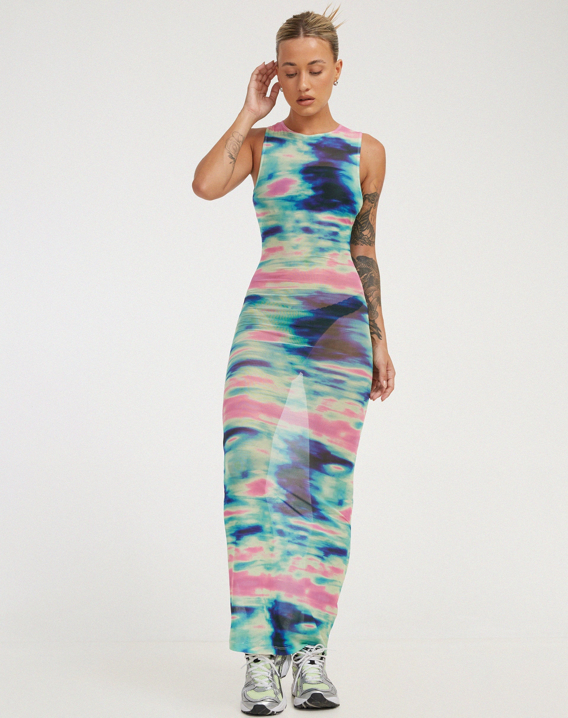 Dare to add some cool prints to your wardrobe this summer. The Roskila dress features a maxi, bodycon fit with a sleeveless design in a multicoloured mesh print. Style with some trainers.
