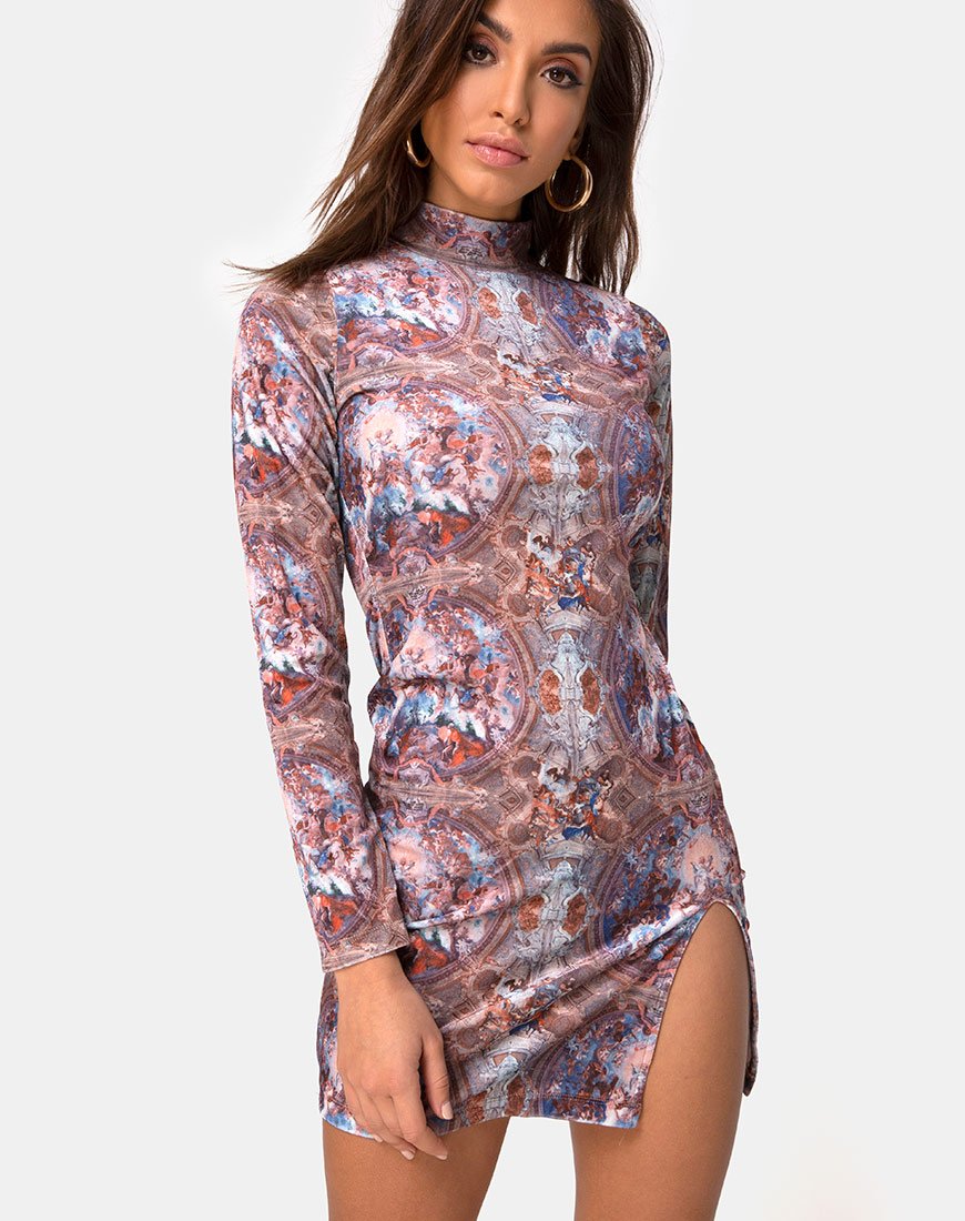 All about the print! Be a showstopper in our Rossel Dress. It features a bodycon fit with a high neck, long sleeves, and a sassy side split in a colorful palace print. Why not team with some sock boots and a cute off the shoulder bag?