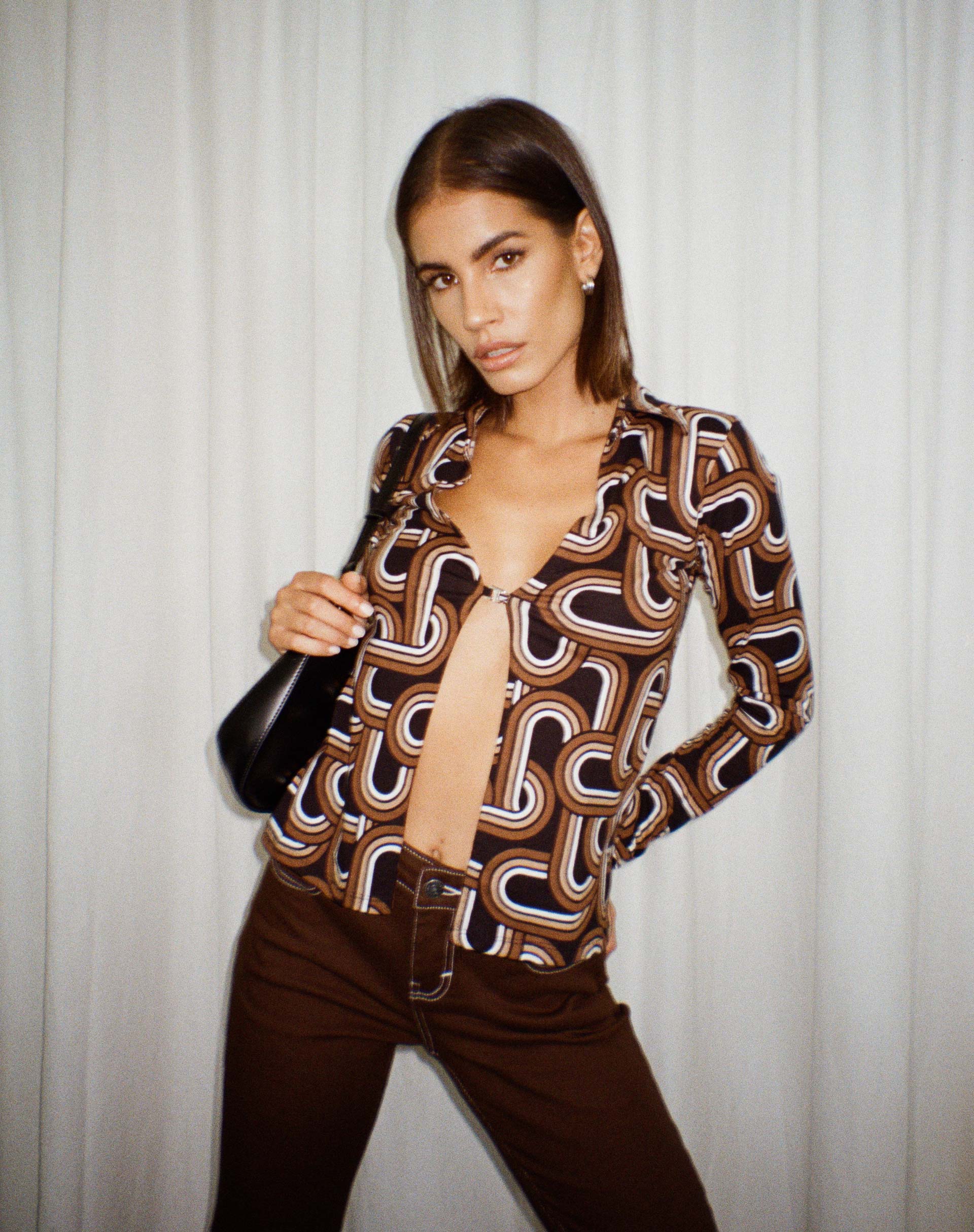 Our Ruix top will add some fresh new prints to your wardrobe. Featuring long sleeves, a plunge neckline with fastening at the front in a black and brown interlink print. Complete your look with our Zoven trousers in PU chocolate.