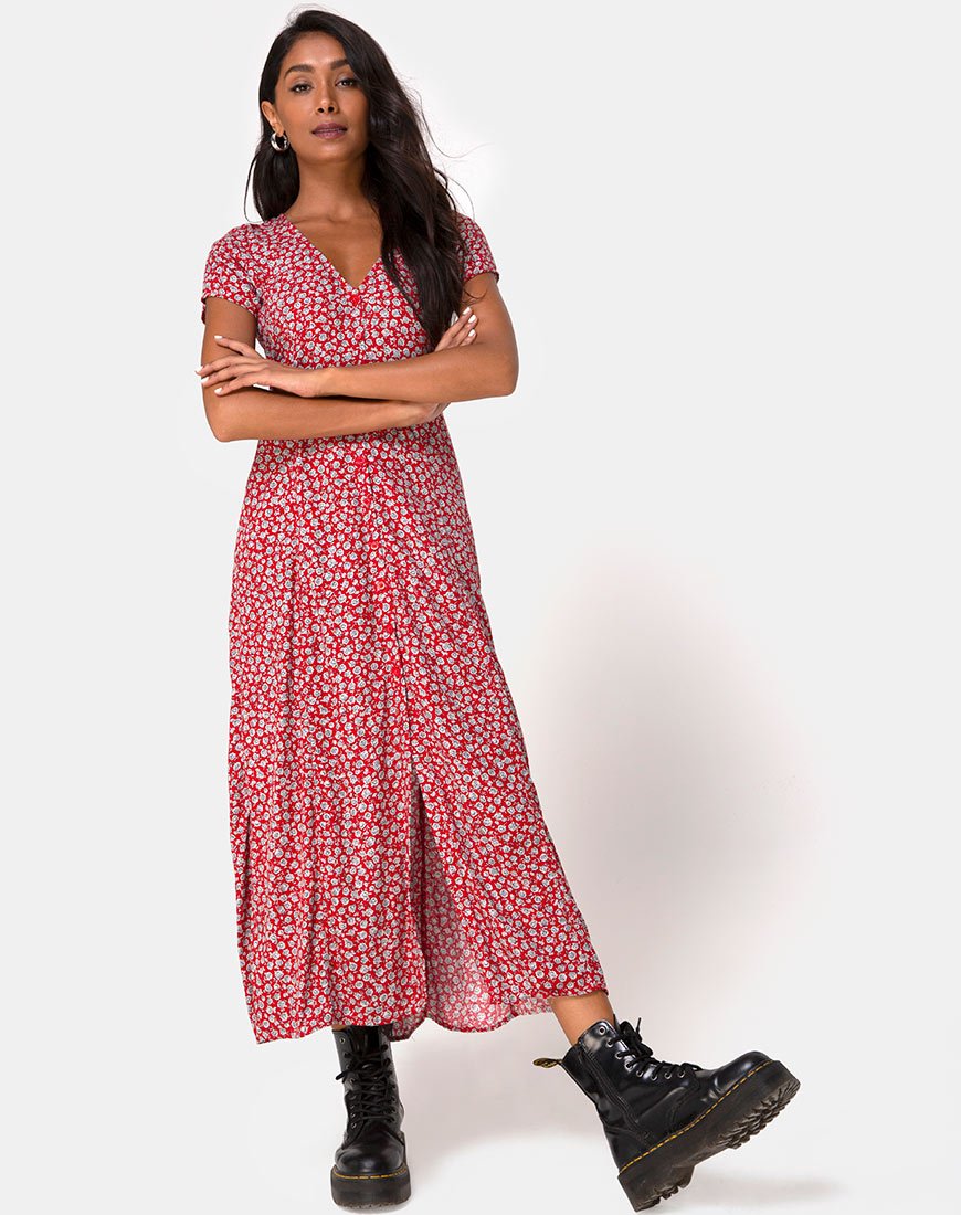 Struggling for summer staples? Look no further than our Sanrin midi dress. It features a button-down front with a middle split, tie detailing, capped sleeves and a v neckline in a red and silver floral print. Team with docs for a dreamy OOTD.