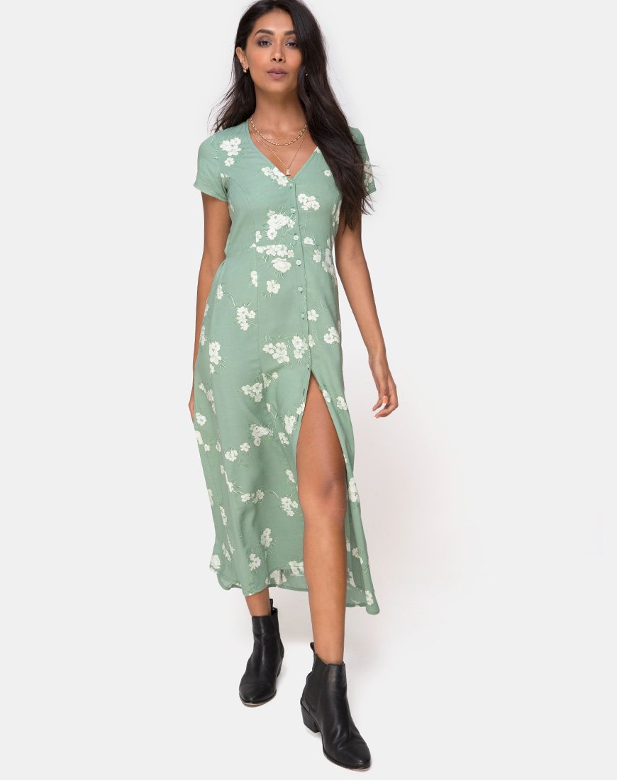 Stay savage and update your wardrobe in Motel's new Sanrin Maxi Dress. Pastel and White Flower Modern Romantic at its' finest. Perfect loose fit maxi dress with a 3/4 button front, v-neck and cap sleeve silhouette this dress can be easily paired with fresh white sneakers or chunky leather boots!