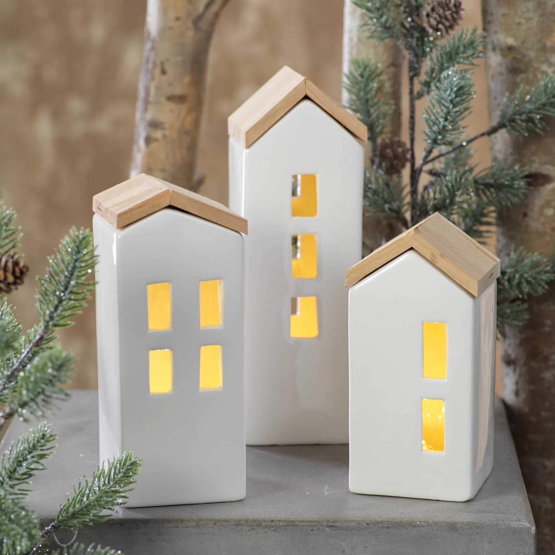 Set of 3 Ceramic LED Houses w/ Wooden Roof